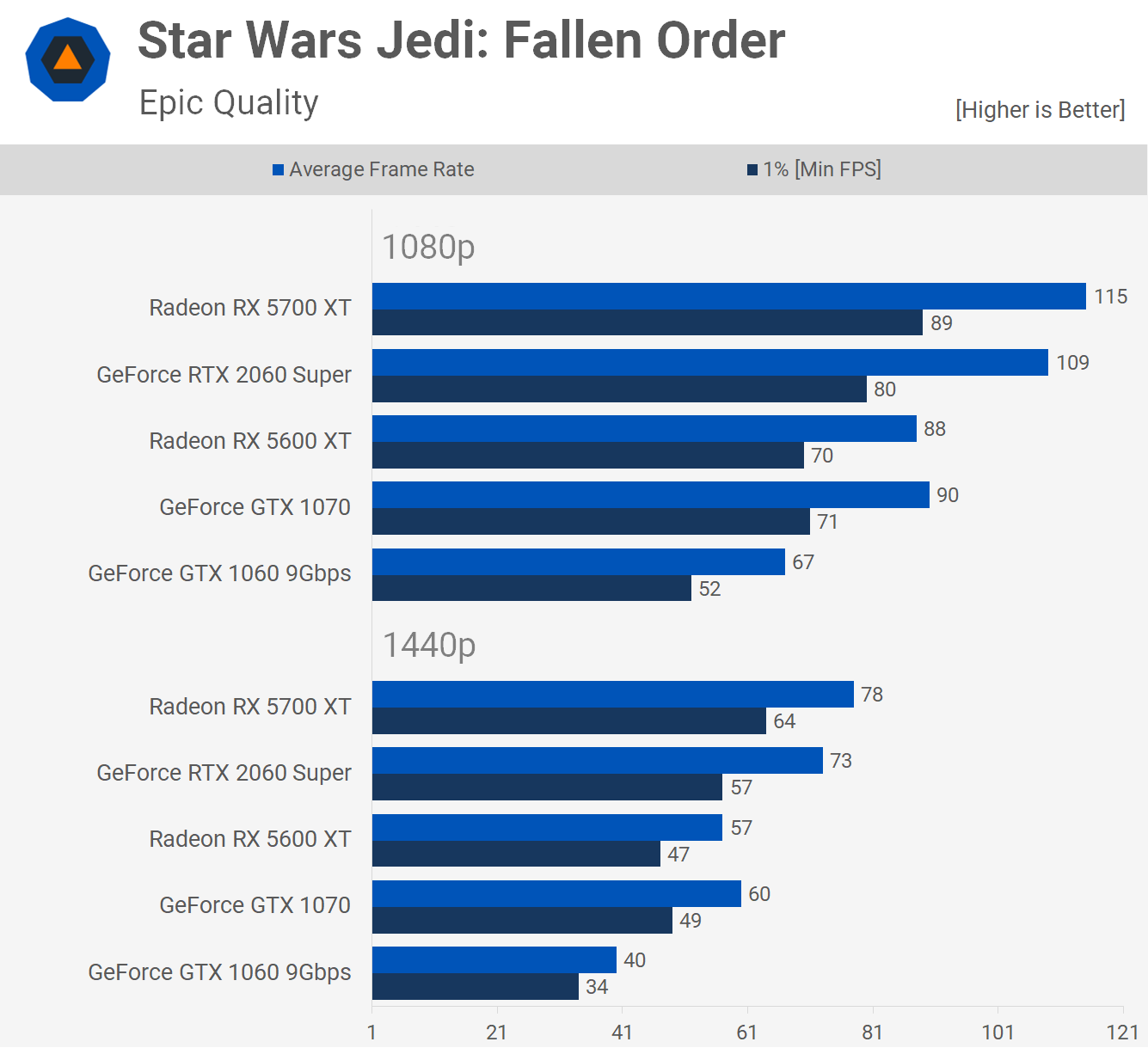 Encore une fois, nous pouvons voir que le 5600 XT ne peut égaler le GTX 1070, cette fois lors des tests avec Star Wars Jedi Fallen Order. La Radeon était 31% plus rapide que la GTX 1060 à 1080p, bien que cette marge ait augmenté à 43% à 1440p, donc au moins dans ce titre, le 5600 XT est nettement plus capable à cette résolution plus élevée.
