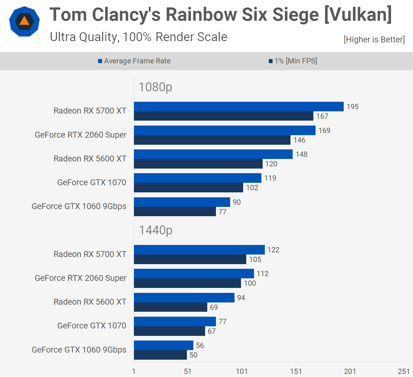 Pour les tests avec Rainbow Six Siege de Tom Clancy, nous avons mis à jour l'API Vulkan. Ici, le 5600 XT était 10% plus rapide que le GTX 1070 et cela signifiait qu'il était 55% plus rapide que le GTX 1060.