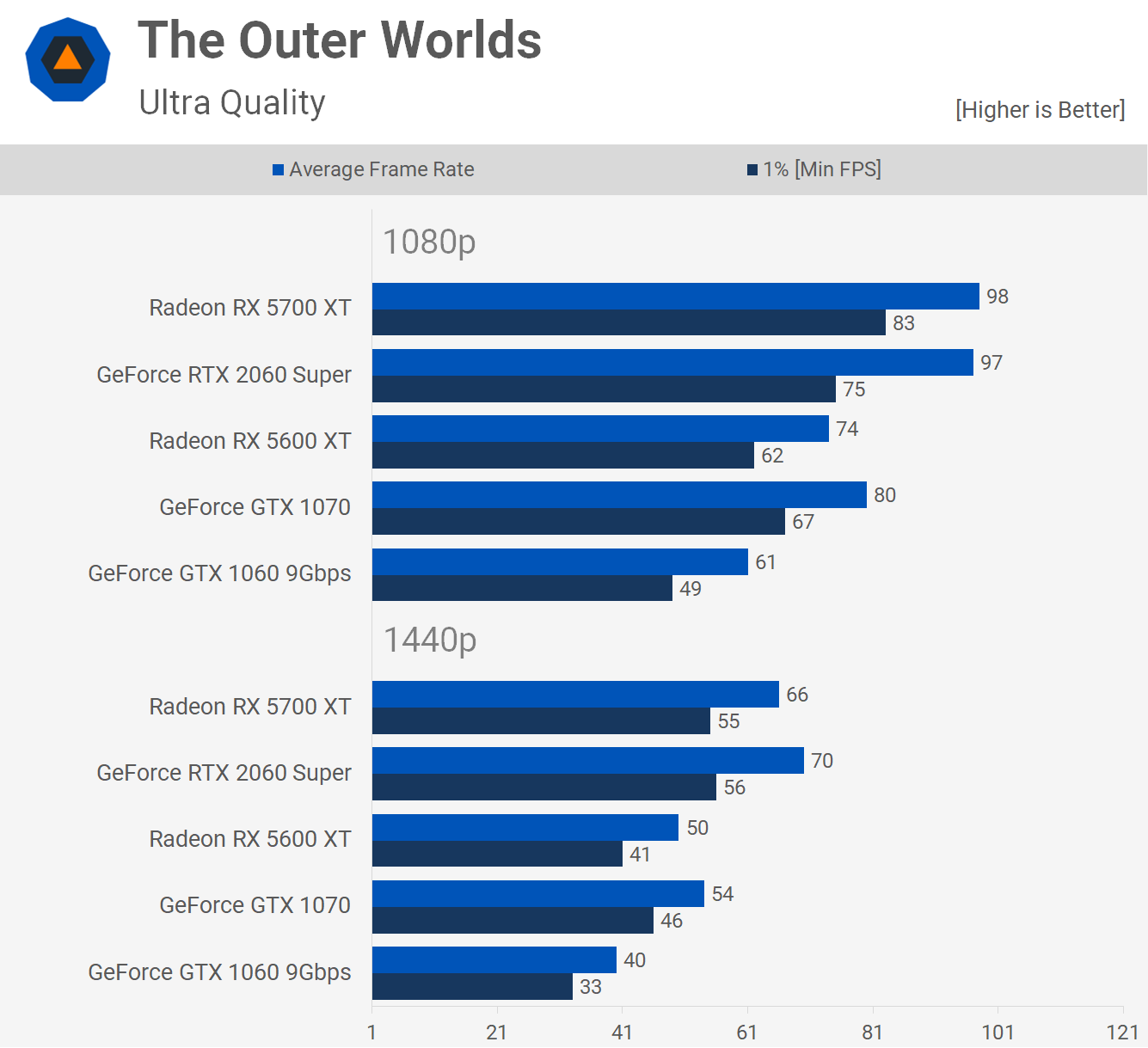 The Outer Worlds utilise le moteur Unreal Engine et puisque ce moteur a été mieux optimisé pour le matériel Nvidia, le 5600 XT ne se comporte pas très bien contre le GTX 1070, avec un retard d'environ 7 à 8% aux deux résolutions testées. Cela fait du nouveau GPU Radeon une mise à niveau assez faible pour les propriétaires de GTX 1060 dans ce titre, juste un gain de 21% à 1080p et 25% à 1440p.