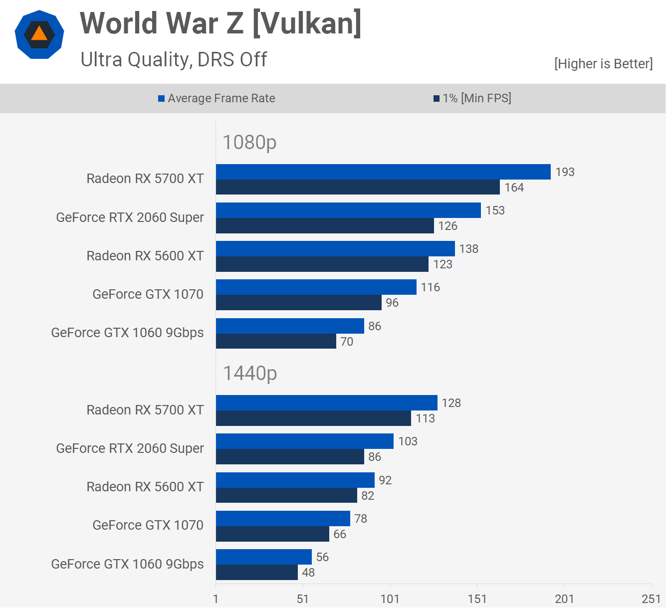 Le 5600 XT a bien fonctionné lors des tests avec World War Z, ici, il était 19% plus rapide que le GTX 1070 à 1080p et cela signifiait qu'il était 60% plus rapide que le GTX 1060.