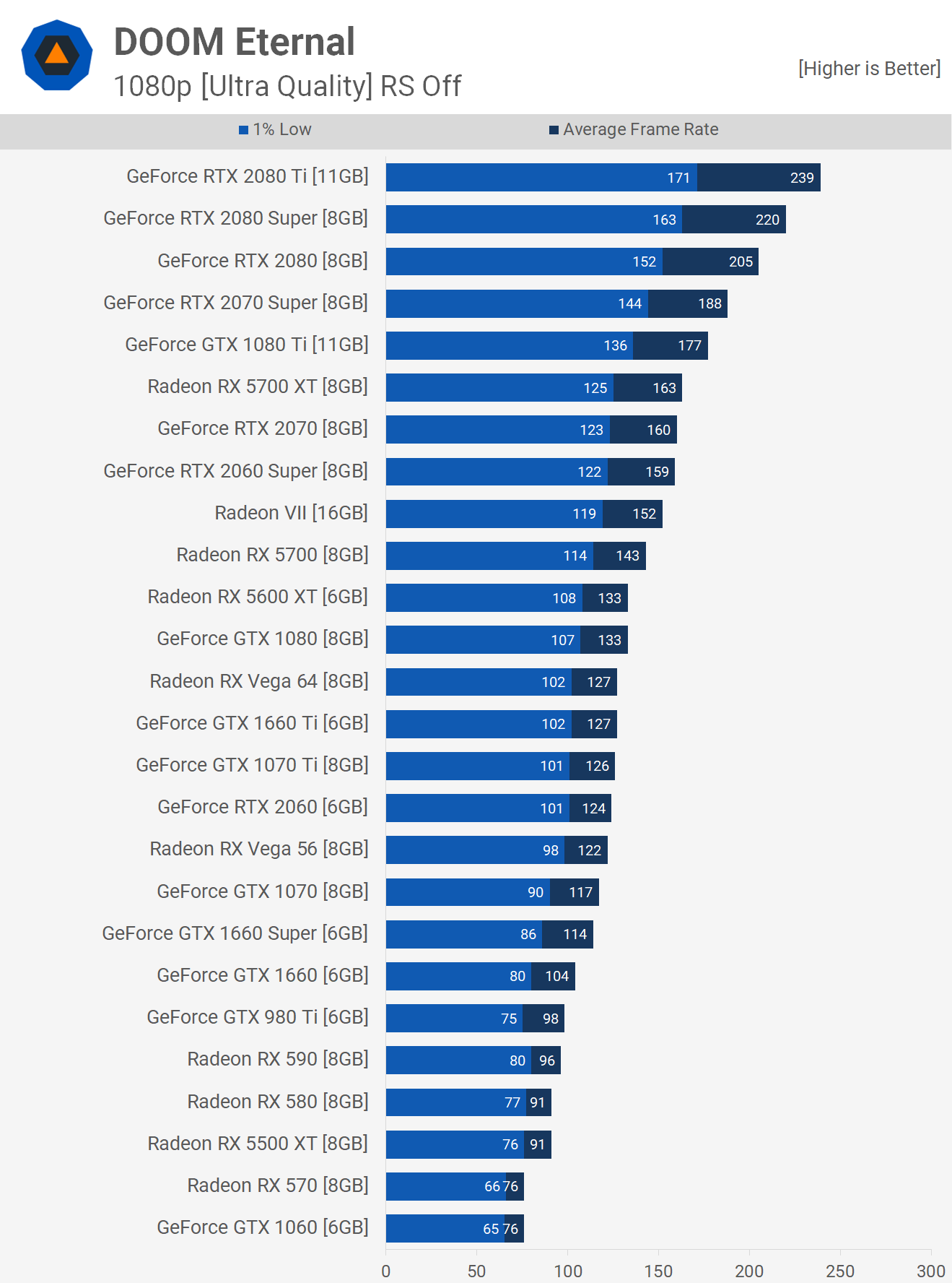 Le matériel AMD et Nvidia fonctionne exceptionnellement bien dans ce titre. Tant que vous avez suffisamment de VRAM, vous êtes prêt à partir. Dans certains tests préliminaires, nous avons cependant remarqué que le matériel ancien éprouve des difficultés sur Doom Eternal, même avec le préréglage de qualité "Faible", mais nous prévoyons de poursuivre ce test sous peu. Ce préréglage bas semble toujours assez bon, mais d'un autre côté, il n'y a pas une tonne de performances supplémentaires à gagner en passant d'ultra à bas. Lorsque nous avons testé cela à l'aide d'un 5700 XT, nous n'avons constaté qu'une augmentation de 21%, ce qui n'est rien compte tenu du fait que nous baissons le préréglage de trois niveaux.