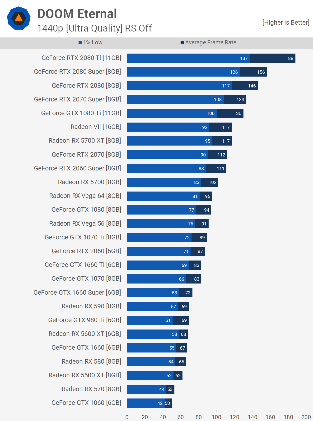 C'est ainsi que la génération actuelle de GPU fonctionne dans Doom Eternal, au moins ceux avec 6 Go de VRAM ou plus. Pour des pièces telles que la série 4 Go 5500 XT ou GTX 1650, nous devrons tester plus tard pour voir comment elles fonctionnent avec une large gamme de GPU plus anciens.