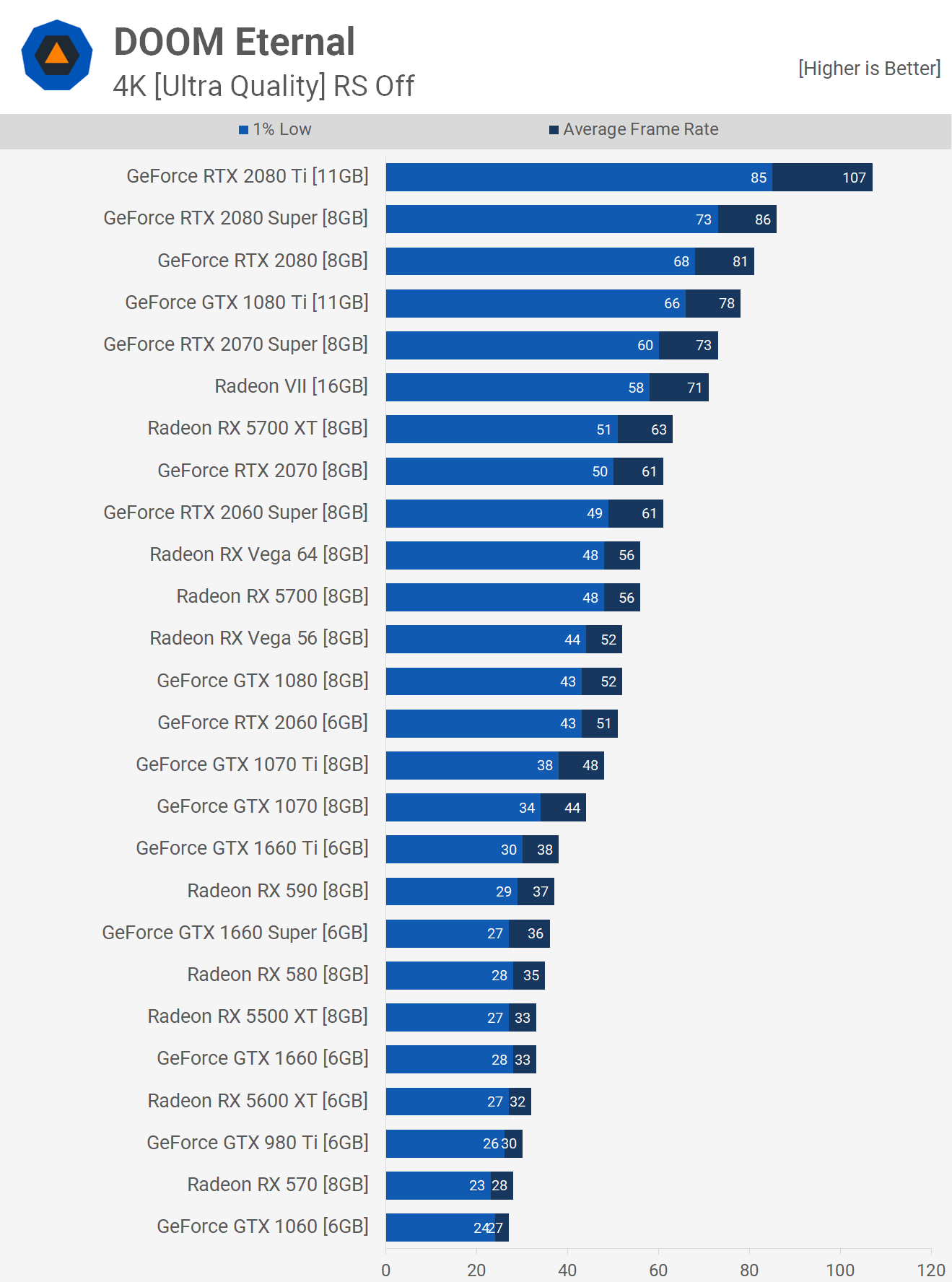 Doom Eternal est le dernier jeu de combat de démons de la série, apportant plus de variété d'armes, plus de possibilités de mouvement, une pléthore de nouveaux démons à affronter – certains tirés des jeux Doom originaux, certains entièrement frais – et de nouveaux environnements passionnants pour explorer. Aujourd'hui, nous prenons 25 cartes graphiques pour voir comment elles fonctionnent dans Doom Eternal en utilisant les derniers pilotes GPU optimisés.