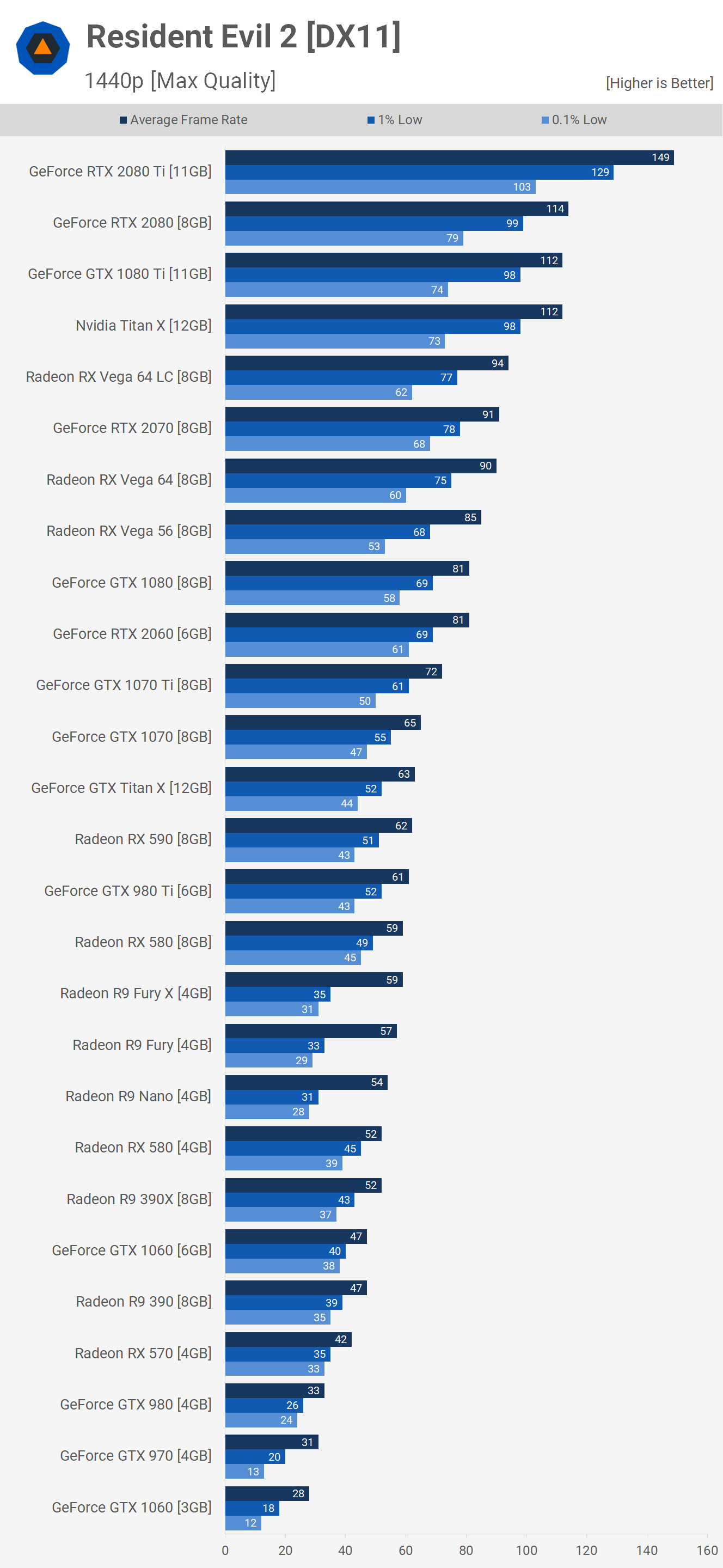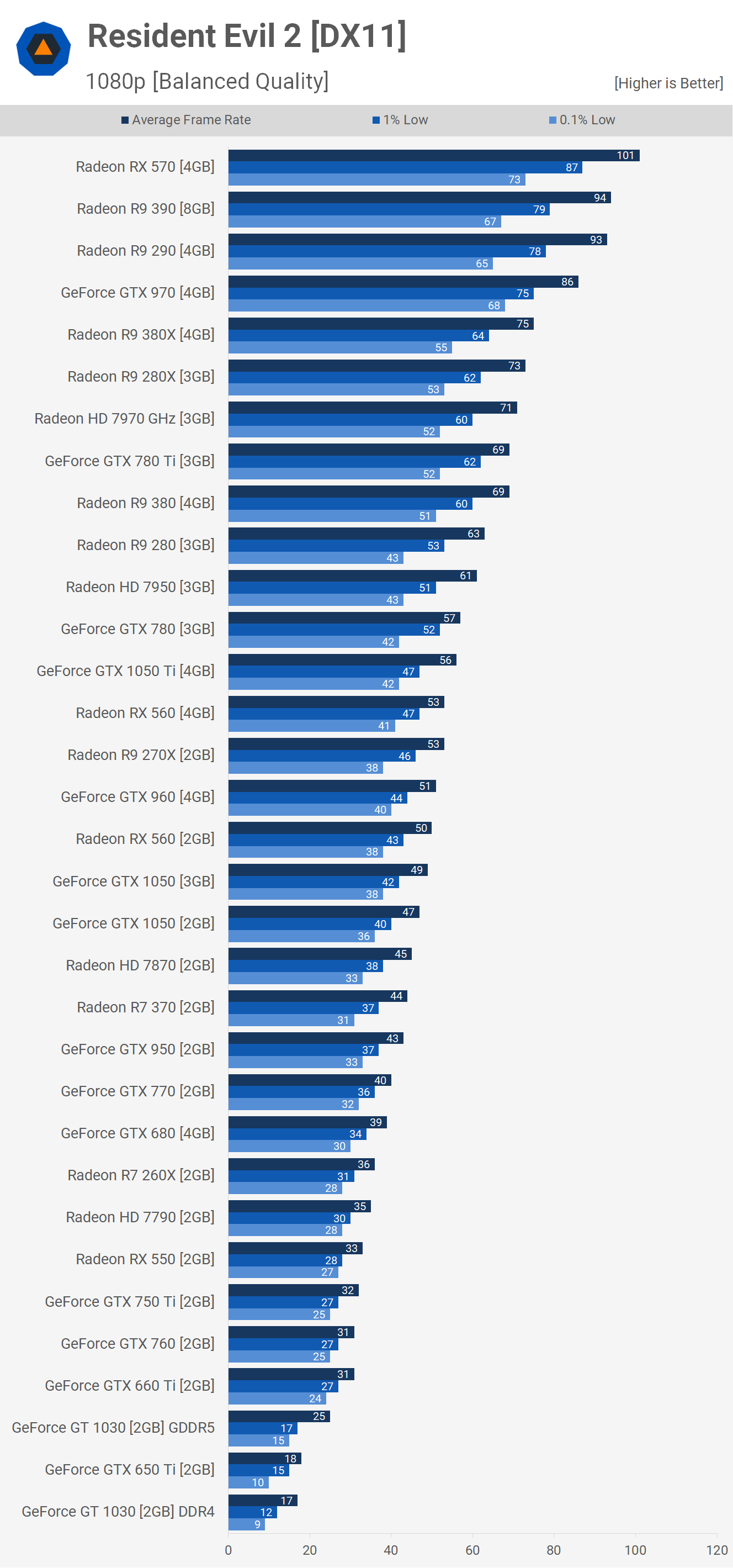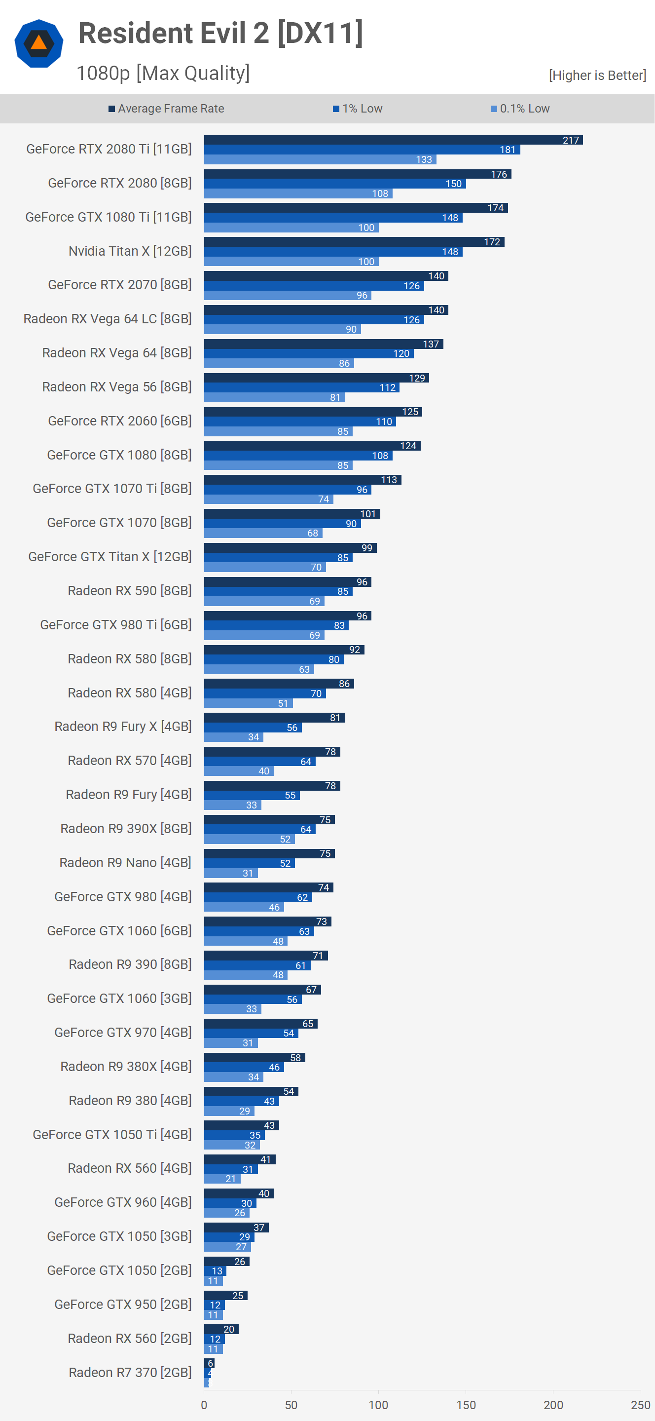 Le RX 590 était à nouveau en mesure de suivre le rythme de la GTX 1070, tandis que le RX 580 était 26% plus rapide que la GTX 1060 6 Go. Les GPU plus anciens de Fury ont continué à se débattre en raison de sa mémoire tampon VRAM limitée de 4 Go, bien que les modèles GCN de 4e génération avec seulement 4 Go de mémoire se soient encore mieux comportés.