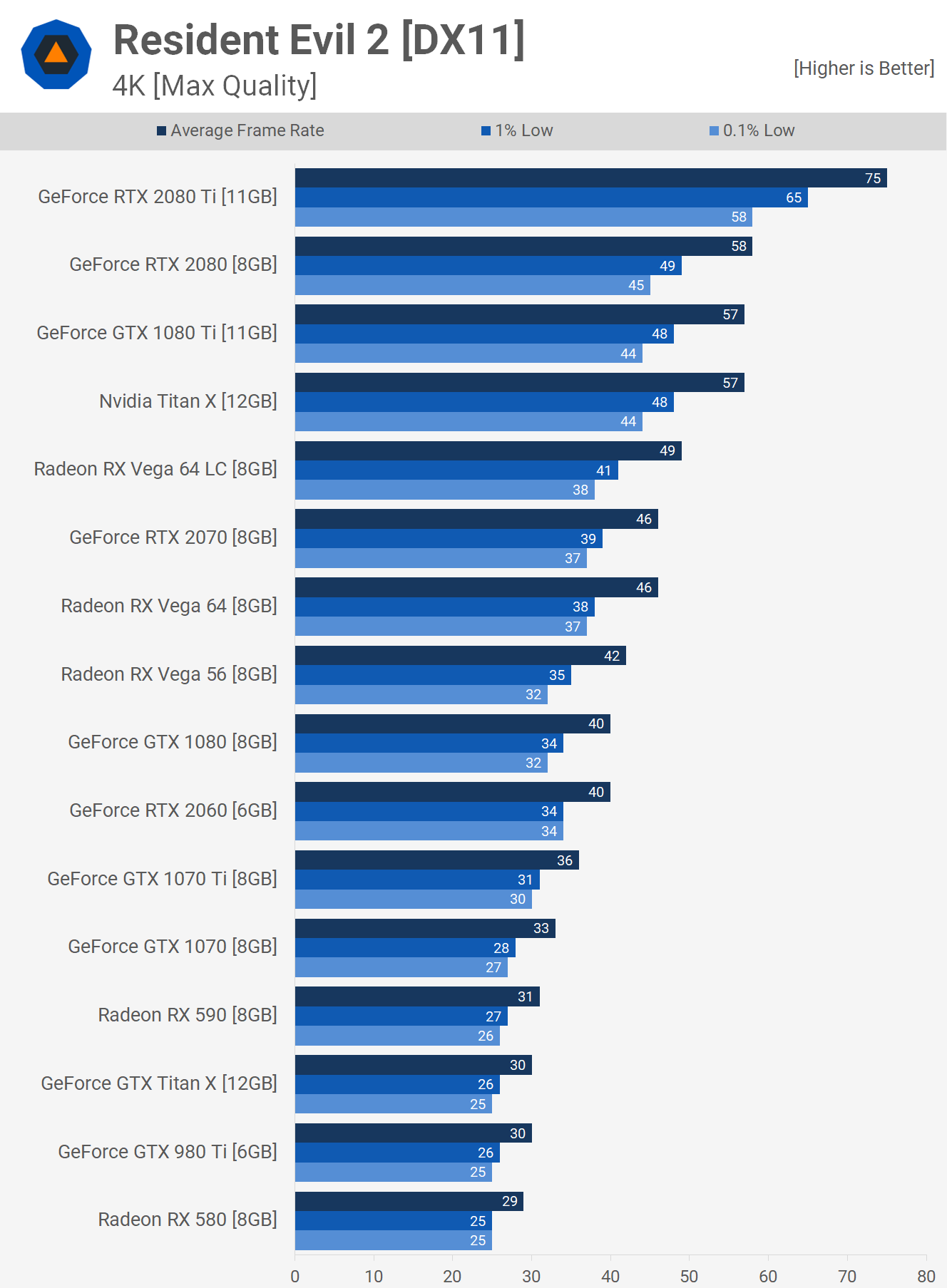 Pour ceux qui jouent à 1440p, il y a quelques bonnes options. Vega 56 en fait certainement partie, tout comme la nouvelle RTX 2060. Cela dit, si vous possédez une Pascal GTX 1070, 1070 Ti ou 1080, vous n’aurez aucun problème à jouer à Resident Evil 2 à 1440p.
