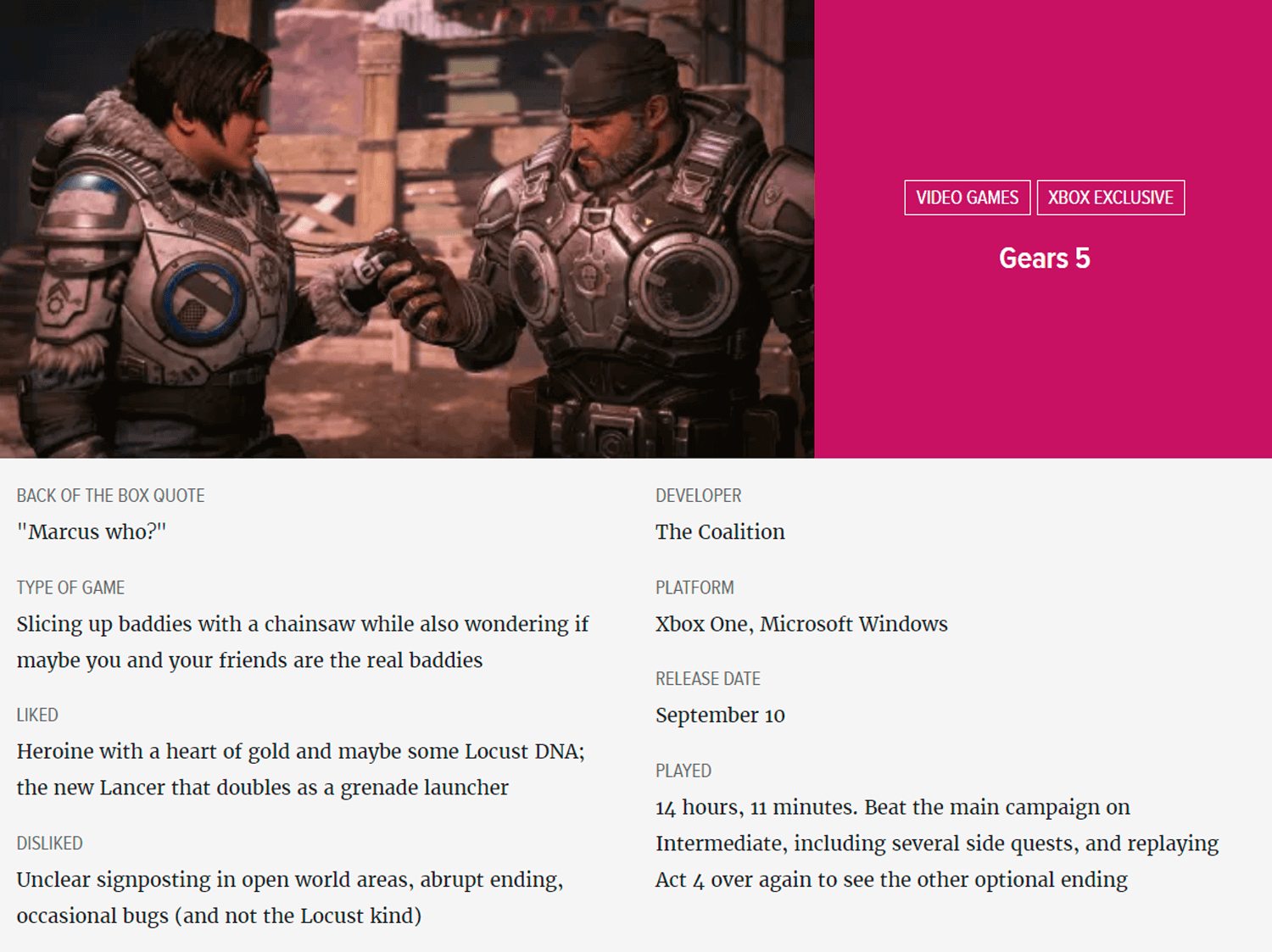L’équipe créative de cette série a beaucoup changé depuis ses débuts. Le monde autour Engrenages a changé aussi. Engrenages 5 semble être le reflet de ces changements. C’est un jeu qui complique davantage son monde et met en scène un héros plus complexe. C’est toujours un jeu avec une arme à la tronçonneuse, mais maintenant, ces armes peuvent avoir un lance-grenades attaché. Parfois, le changement est bon.