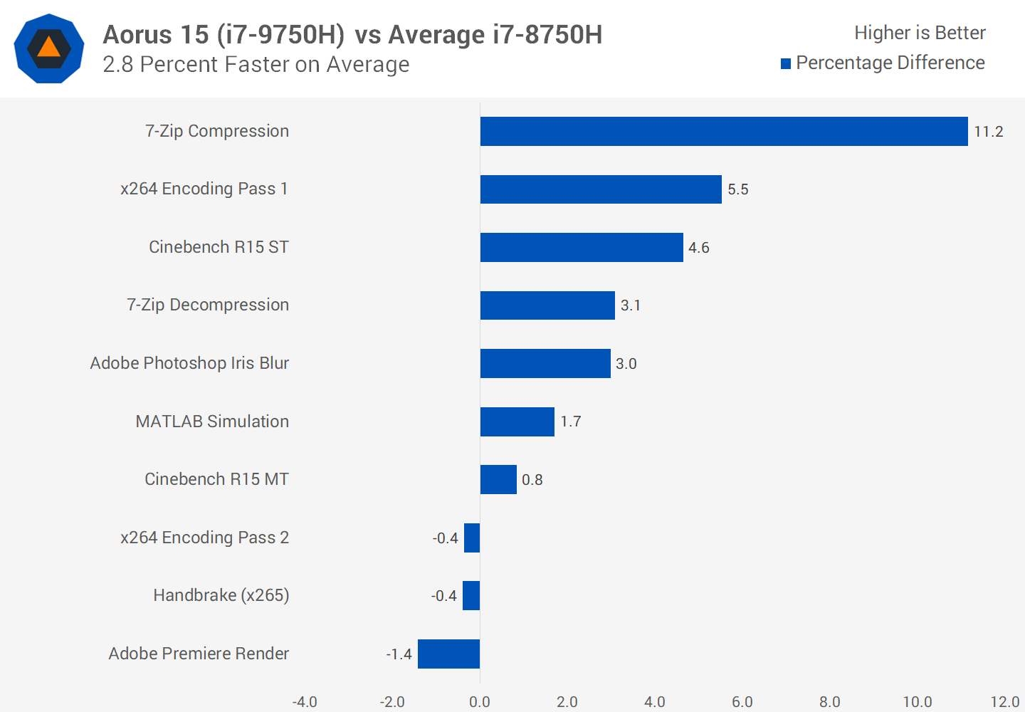 Nous n’avons pas discuté de la façon dont le 9750H se compare au quadricœur Core i7-7700HQ, un chemin de mise à niveau commun pour de nombreux acheteurs provenant d'ordinateurs portables de jeu de la génération précédente. Le Core i7-9750H étant très similaire au 8750H, nous envisageons des gains pouvant atteindre 50%. ou plus dans certaines charges de travail, avec une moyenne dans cette sélection de 42%.