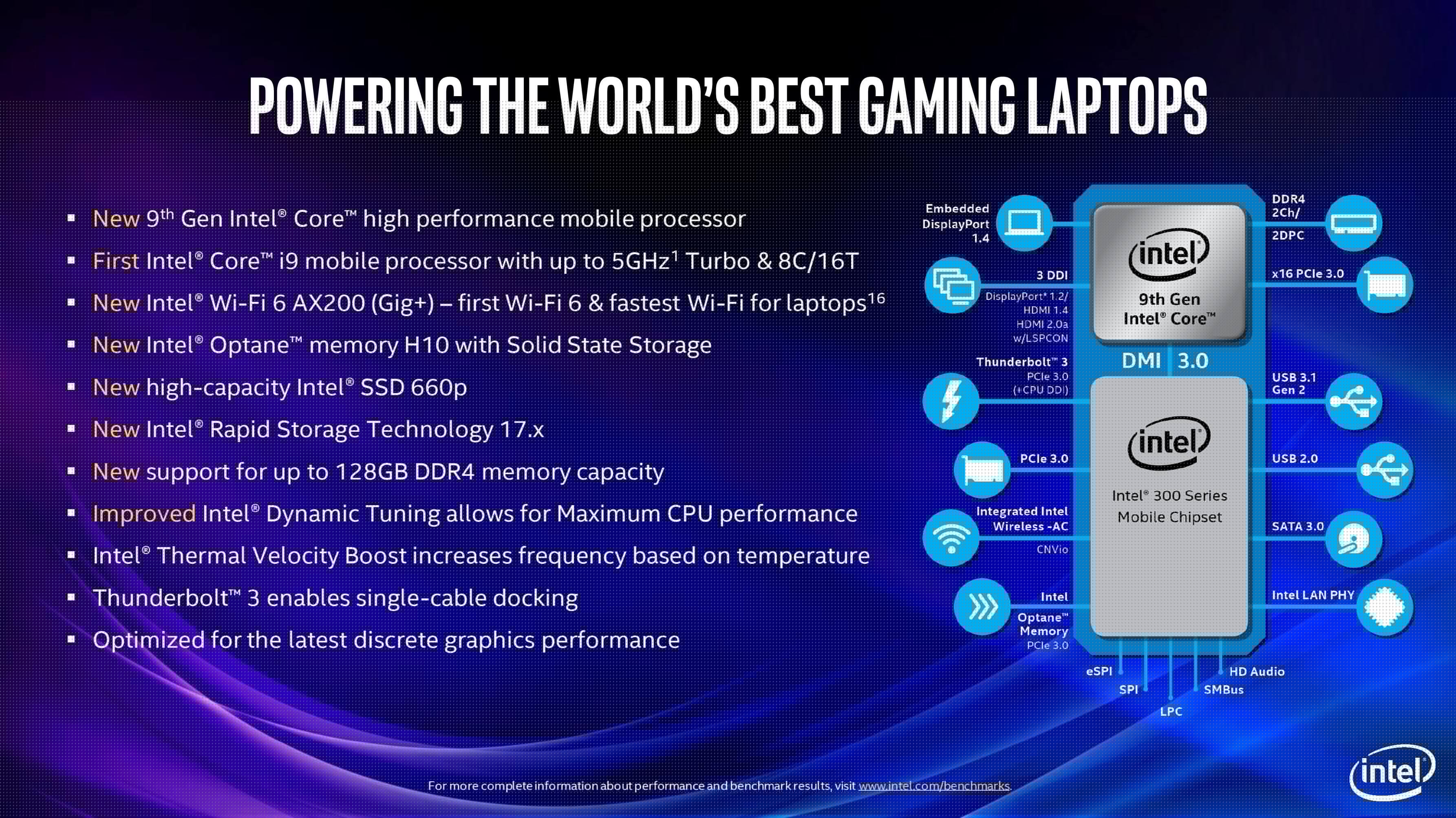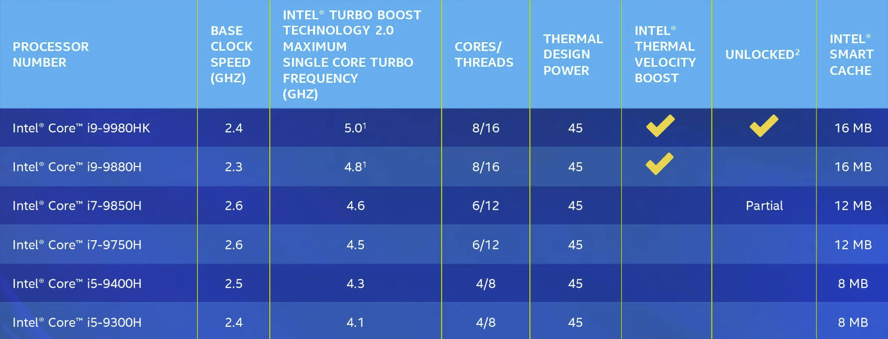 Et puis, bien sûr, les nouveaux modèles Core i9, qui apportent 8 cœurs et 16 threads aux ordinateurs portables pour correspondre aux modèles de bureau Core i9 les plus performants. Le i9-9980HK peut même atteindre 5,0 GHz, comme le 9900K, dans un TDP de 45W. Ces Core i9 à huit cœurs remplacent le Core i9 de huitième génération, qui était toujours composé de six cœurs avec des horloges plus hautes.