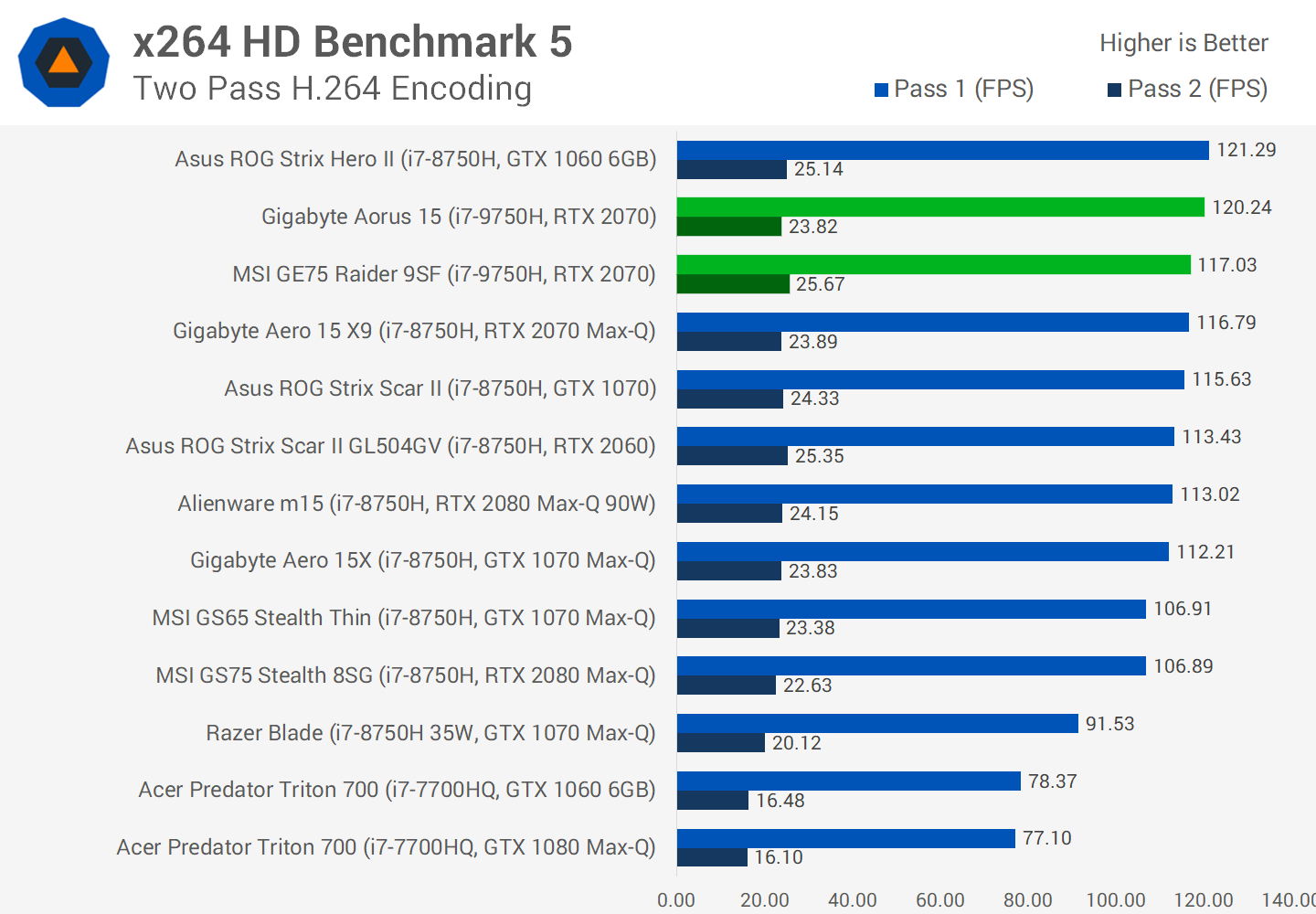 En encodage x264, les ordinateurs portables Core i7-9750H fonctionnent bien dans le premier passage, mais le système Gigabyte revient au groupe lors du second passage. Le modèle MSI est carrément le plus rapide, mais très légèrement supérieur aux modèles Asus performants, à hauteur de 1%. Pas exactement la mise à niveau que certains voudraient.
