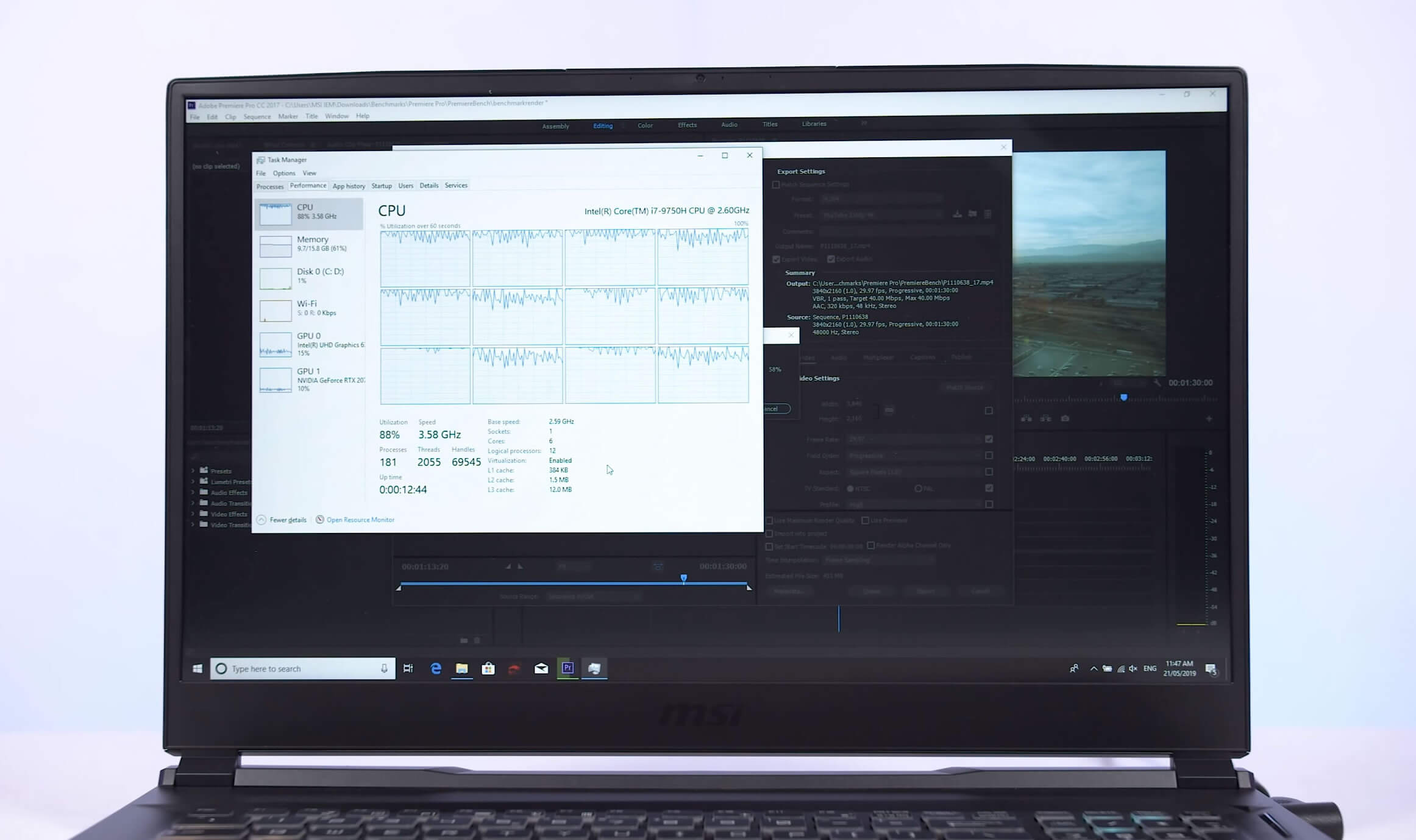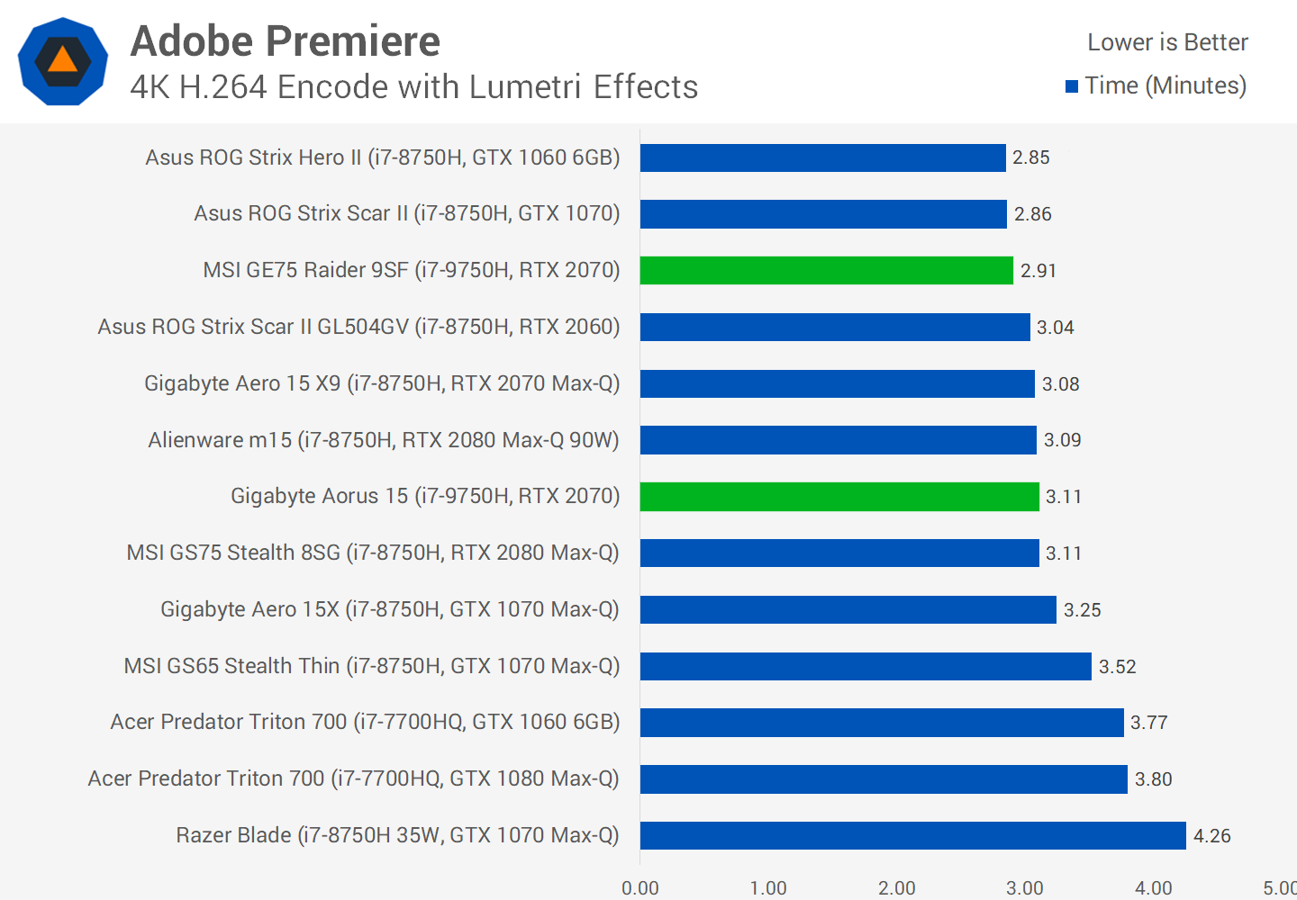 Notre benchmark Premiere avec effets Lumetri, bien qu’il utilise quelque peu le GPU, devient limité en ressources de traitement après l’utilisation d’une GTX 1060 ou d’une autre. Donc, encore une fois, nous sommes dans une situation où le modèle MSI n’est pas le plus rapide mais se comporte bien, tandis que le modèle Gigabyte n’est pas différent de la plupart des ordinateurs portables Core i7-8750H.