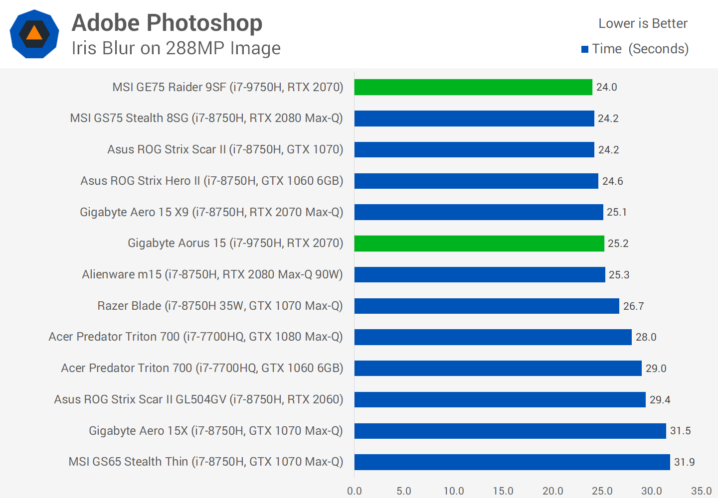Vous avez probablement déjà vu un graphique comme celui-ci les dernières fois: Adobe Photoshop avec l'effet Iris Blur limité par le processeur est une bonne représentation pour le 9750H mais n'est pas plus rapide que le 8750H.