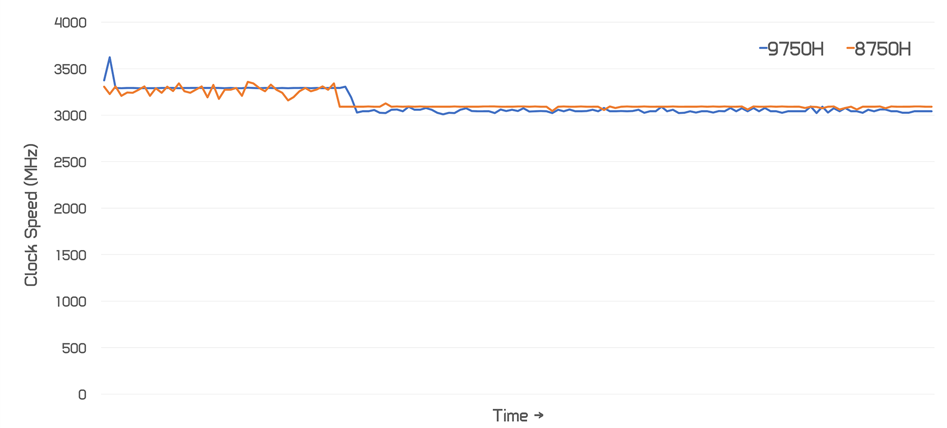 Cela diffère encore du 8750H, qui autorise 4,1 GHz sur un maximum de deux cœurs, 4,0 GHz sur un maximum de quatre cœurs, puis 3,9 GHz sur six cœurs. Ainsi, lorsque la 9750H est pleinement utilisée sur six cœurs, son horloge turbo maximale ne dépasse pas 100 MHz au-dessus de 8750H. Il faut garder à l’esprit et montrer qu’une bonne partie des améliorations d’Intel ont ciblé une utilisation simple ou faible du nombre de cœurs.
