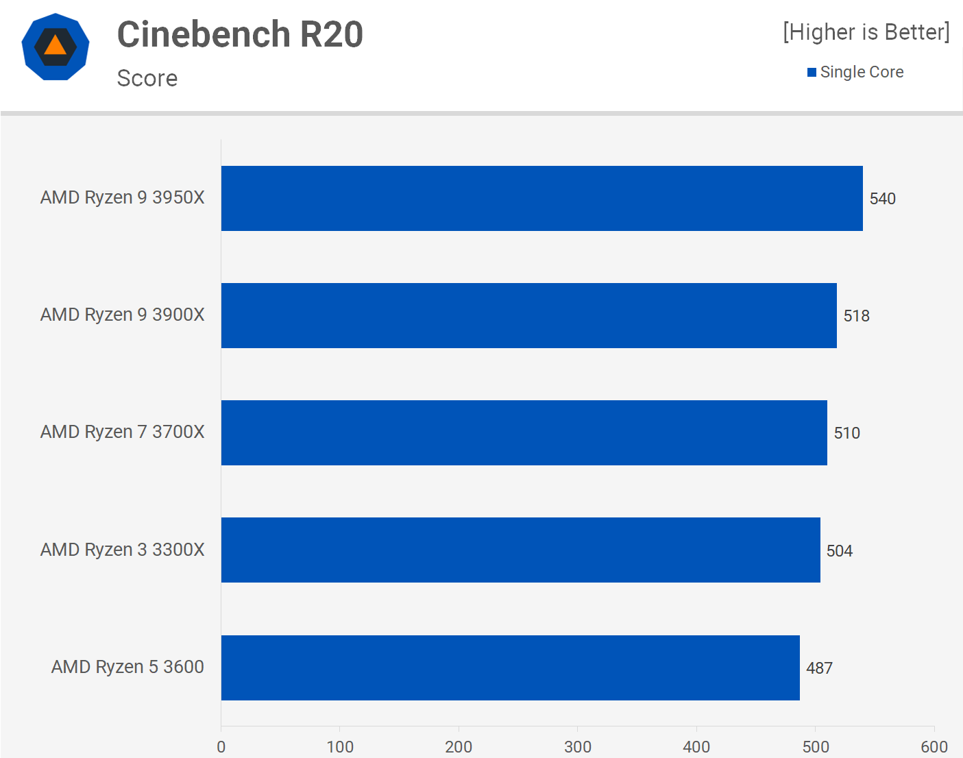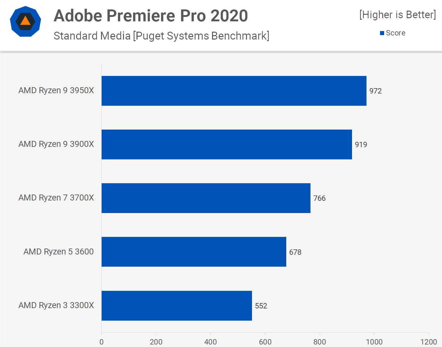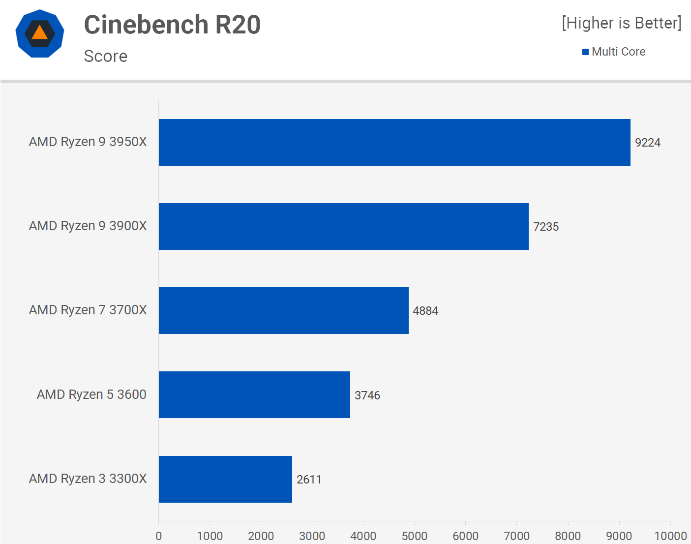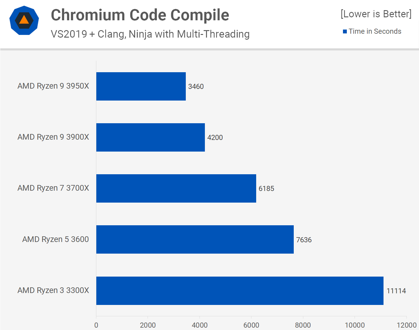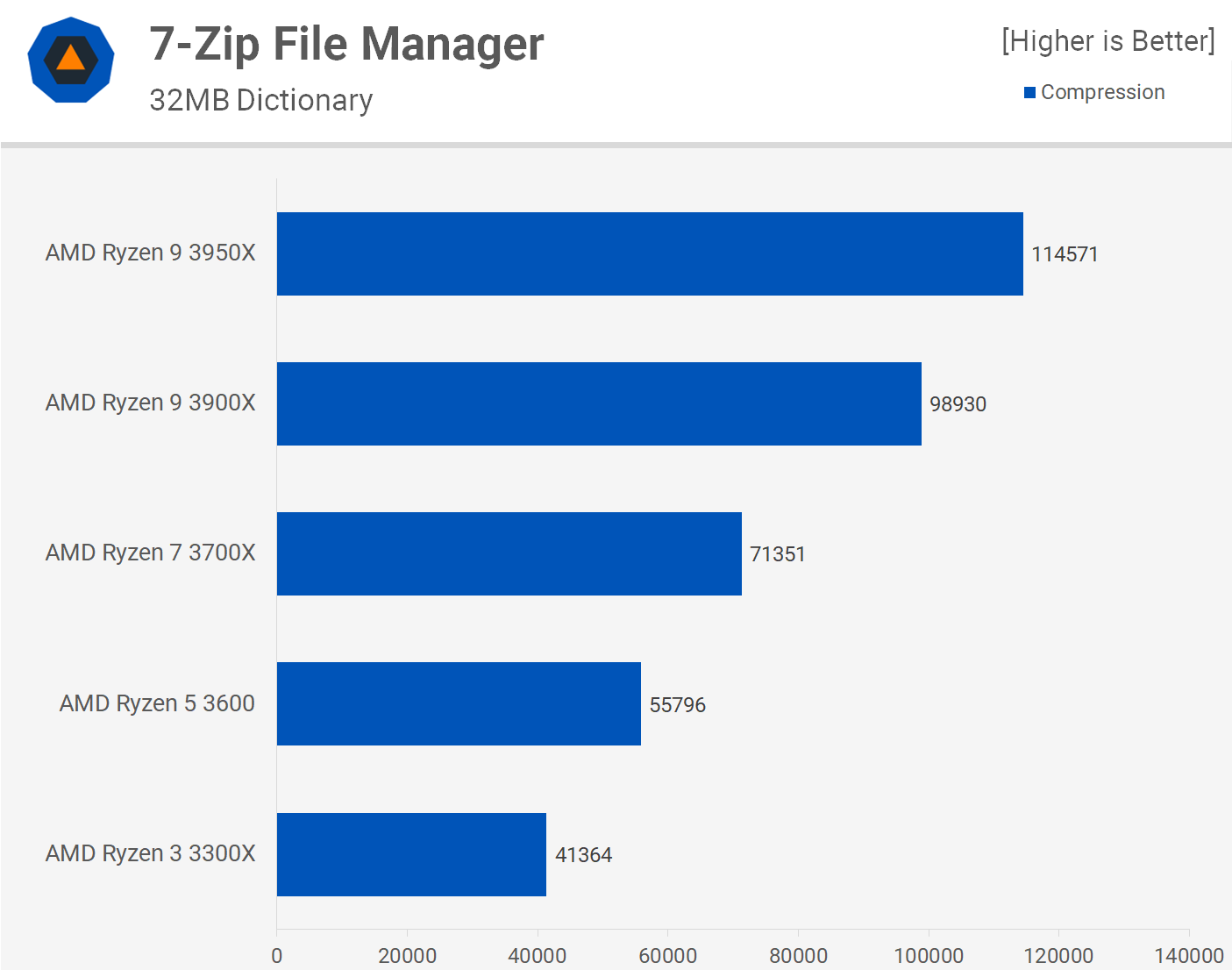 Il y a une augmentation de 43% des performances lors du saut du 3300X au 3600, les 30% du 3600 au 3700X, 48% du 3700X au 3900X, puis un saut de 27% du 3900X au 3950X. Certaines de ces marges seront influencées par la fréquence, mais globalement, à peu près ce que vous attendez de voir.