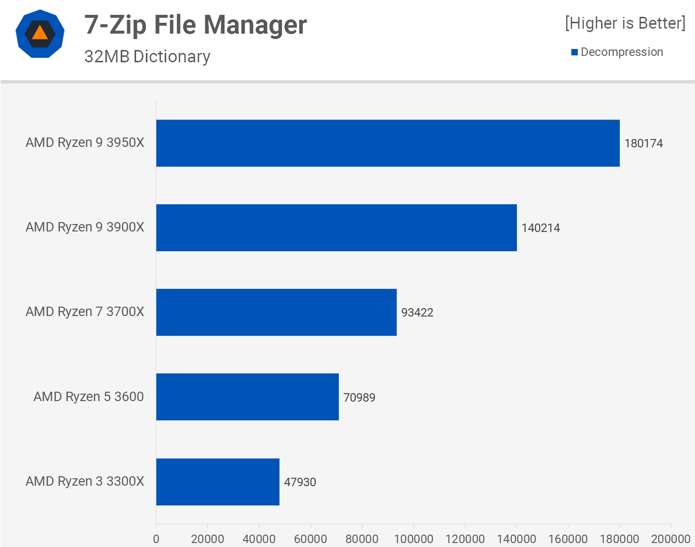 Les résultats de la compression 7-zip sont intéressants car ce test ne tire pas pleinement parti du SMT (multithreading simultané), du moins pour les parties à plus grand nombre de cœurs. Nous constatons une augmentation de 35% des performances lors du saut du 3300X au 3600, 28% du 3600 au 3700X, 39% du 3700X au 3900X, puis seulement 16% du 3900X au 3950X. Le 3950X 16 cœurs et 32 threads n'est pas bien exploité ici, alors examinons les résultats de décompression qui font une bien meilleure utilisation du SMT.
