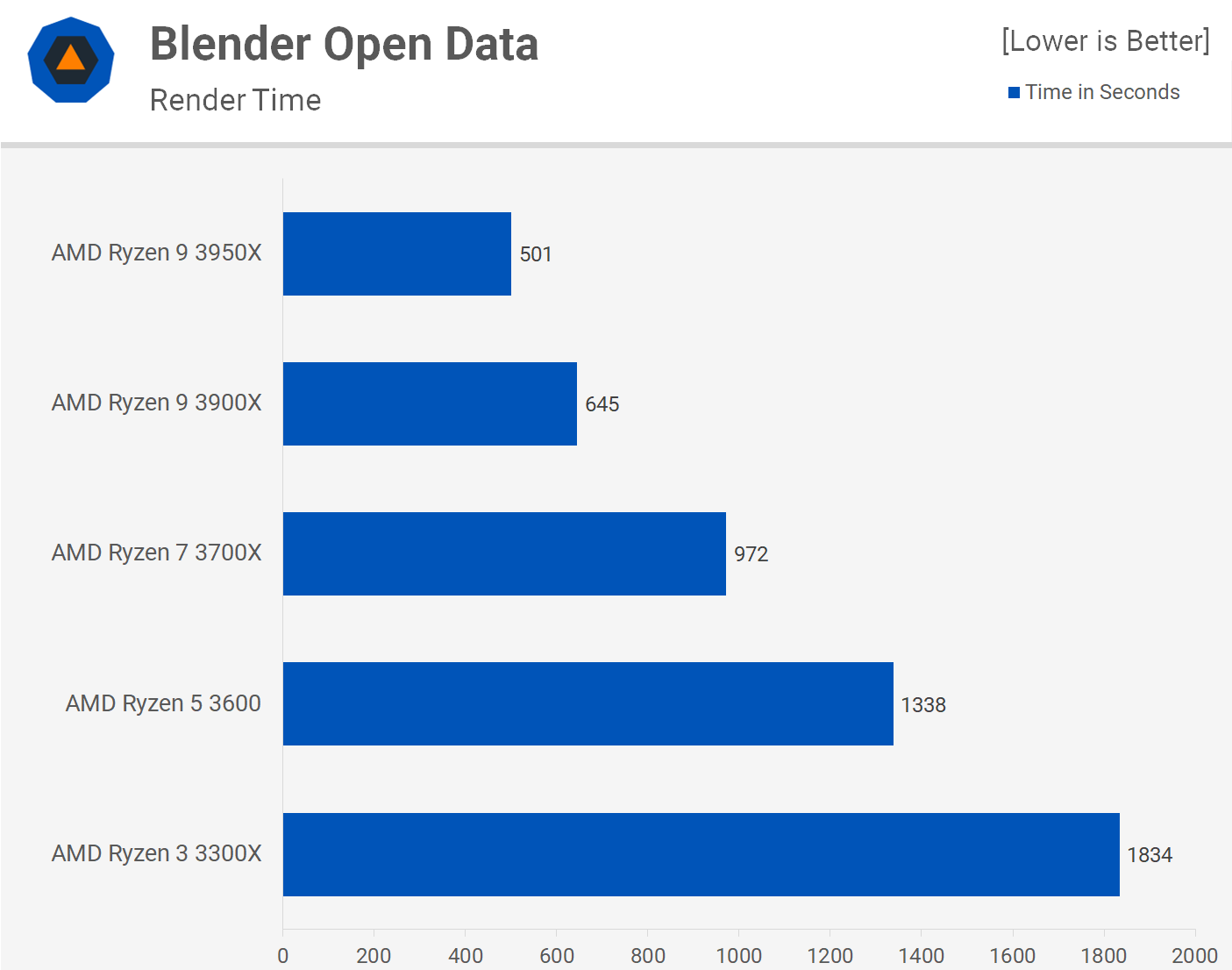 Blender peut également tirer pleinement parti des processeurs lourds, jusqu'au Threadripper 3990X 64 cœurs. Par conséquent, les performances évoluent en conséquence. Cela dit, alors que le 3900X réduira le temps de rendu du 3700X de 33%, nous ne constatons qu'une réduction de 22% lors du passage au 3950X du 3900X. Si le temps c'est de l'argent, alors le 3950X a du sens, mais ici, nous voyons des rendements décroissants après le Ryzen 9 3900X.
