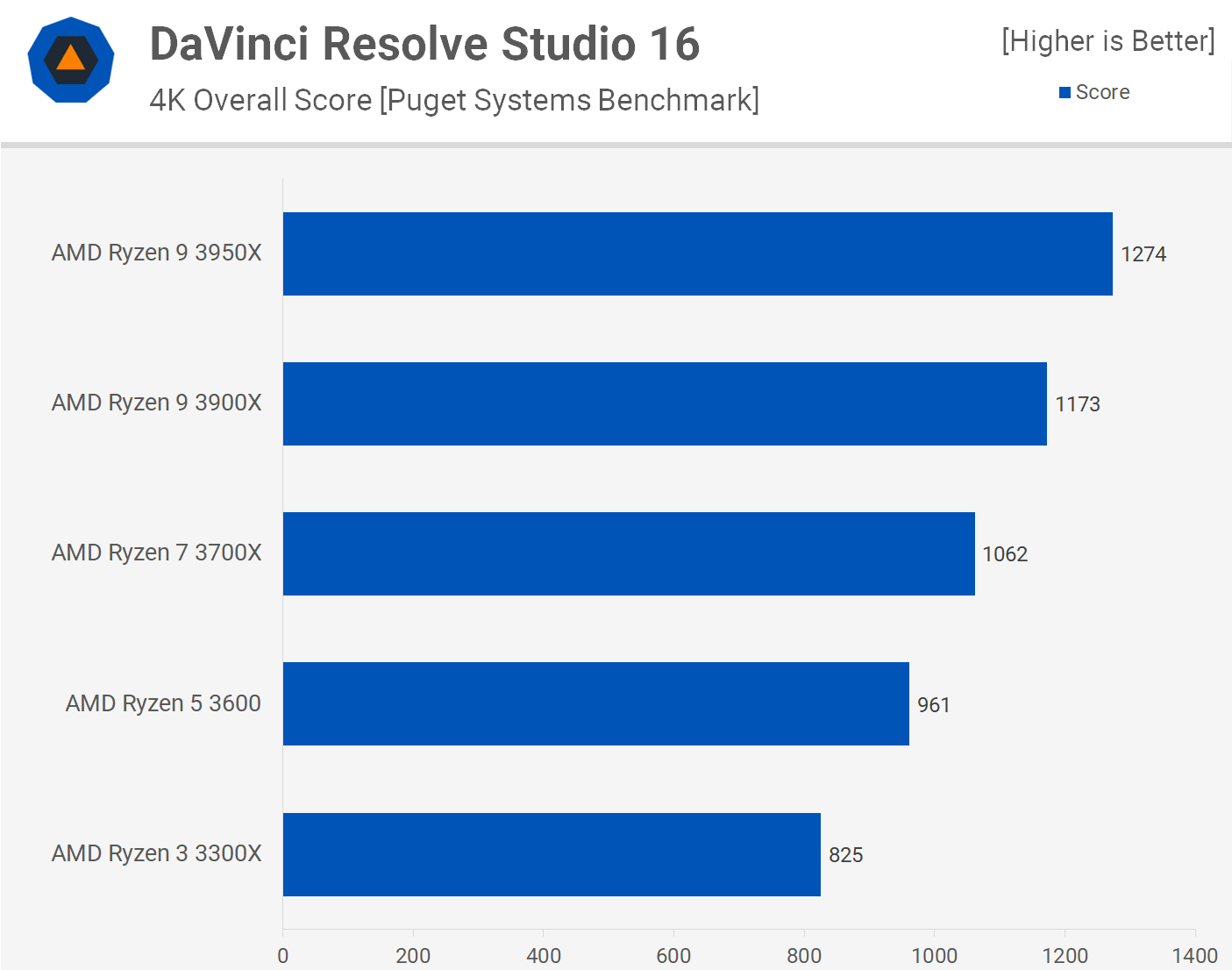 Le benchmark DaVinci Resolve Studio 16 est intéressant car il s'agit d'un test de charge de travail mixte, il ne fixe pas ces processeurs à 100% d'utilisation du début à la fin, comme tous les logiciels de production vidéo, mais l'utilisation est partout. Le saut de performance le plus important est visible lors de la mise à niveau du 3300X vers le 3600, mais au-delà, vous obtenez des incréments plus petits d'une série à l'autre.