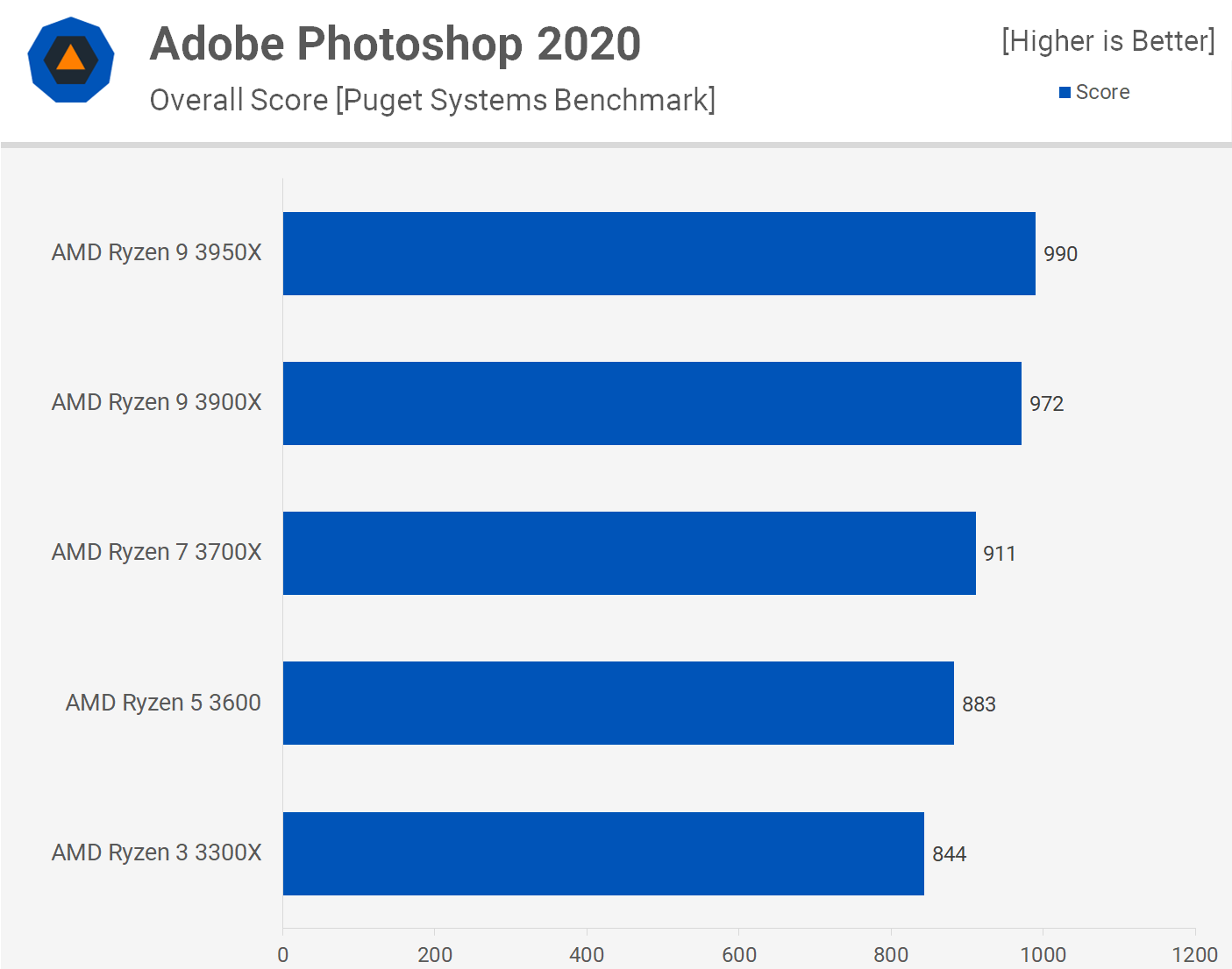 Adobe Photoshop est la première application de notre suite où les processeurs lourds ne sont pas très bien utilisés. Nous constatons une augmentation des performances de seulement 17% du 3300X au 3950X, même si le processeur Ryzen 9 contient quatre fois plus de cœurs.
