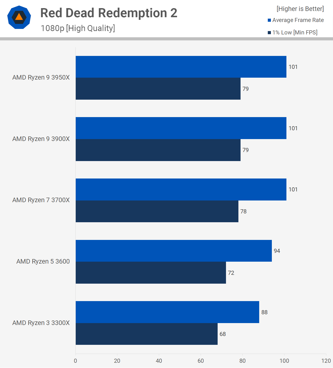 Red Dead Redemption 2 est un autre titre gourmand en CPU qui montre de solides gains de performances jusqu'au 3700X 8 cœurs. Le jeu joue très bien sur le 3300X sans bégaiement notable, donc avec les cartes graphiques bas de gamme, les marges s'évaporent rapidement, mais si vous voyez des performances maximales dans ce titre dans des conditions de processeur limitées, le 3700X est la puce à obtenir.