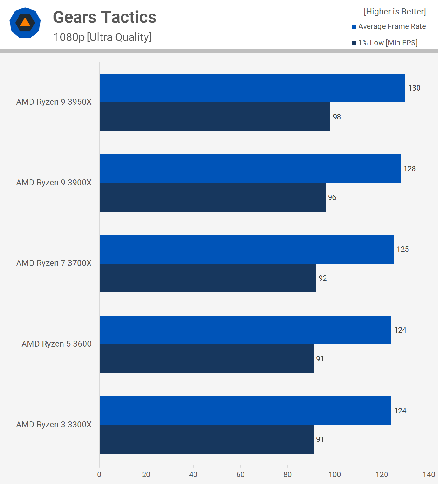 Fait intéressant, Gears Tactics va dans l'autre sens, même si nous pensons que les avantages que nous voyons ici sont liés aux performances d'un seul cœur, car le 3300X correspond au 3600 et les pièces Ryzen 9 haut de gamme qui cadencent un peu plus haut offrent de très faibles gains de performances.