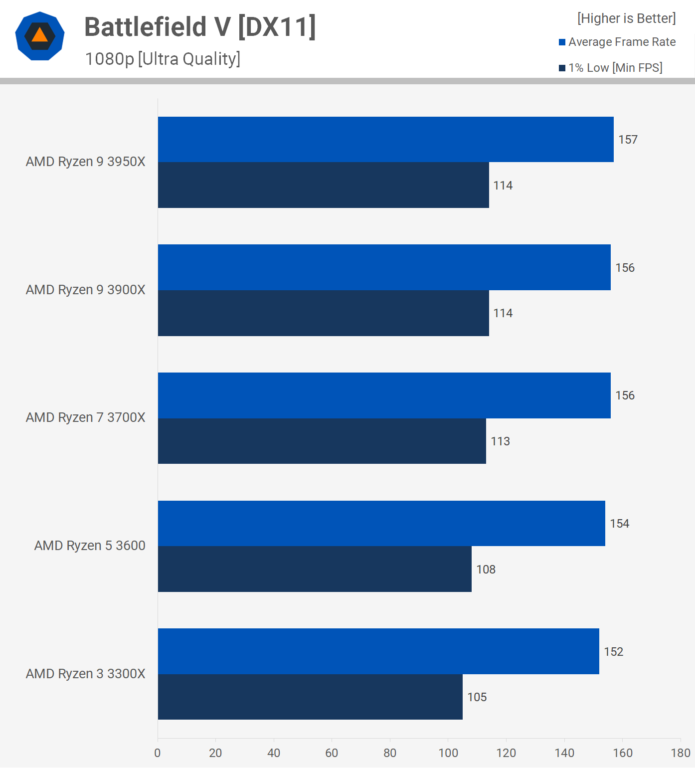 Bien sûr, si vous avez un budget serré où chaque dernier dollar compte, alors vous inquiéter des performances de jeu futures pourrait être moins un problème, et donc économiser 50 $ en obtenant le 3300X pourrait être la solution préférée. Ce qui est clair ici, c'est que passer à 8 cœurs avec le 3700X a très peu d'impact sur les performances de Battlefield V et aller au-delà est un exercice inutile.