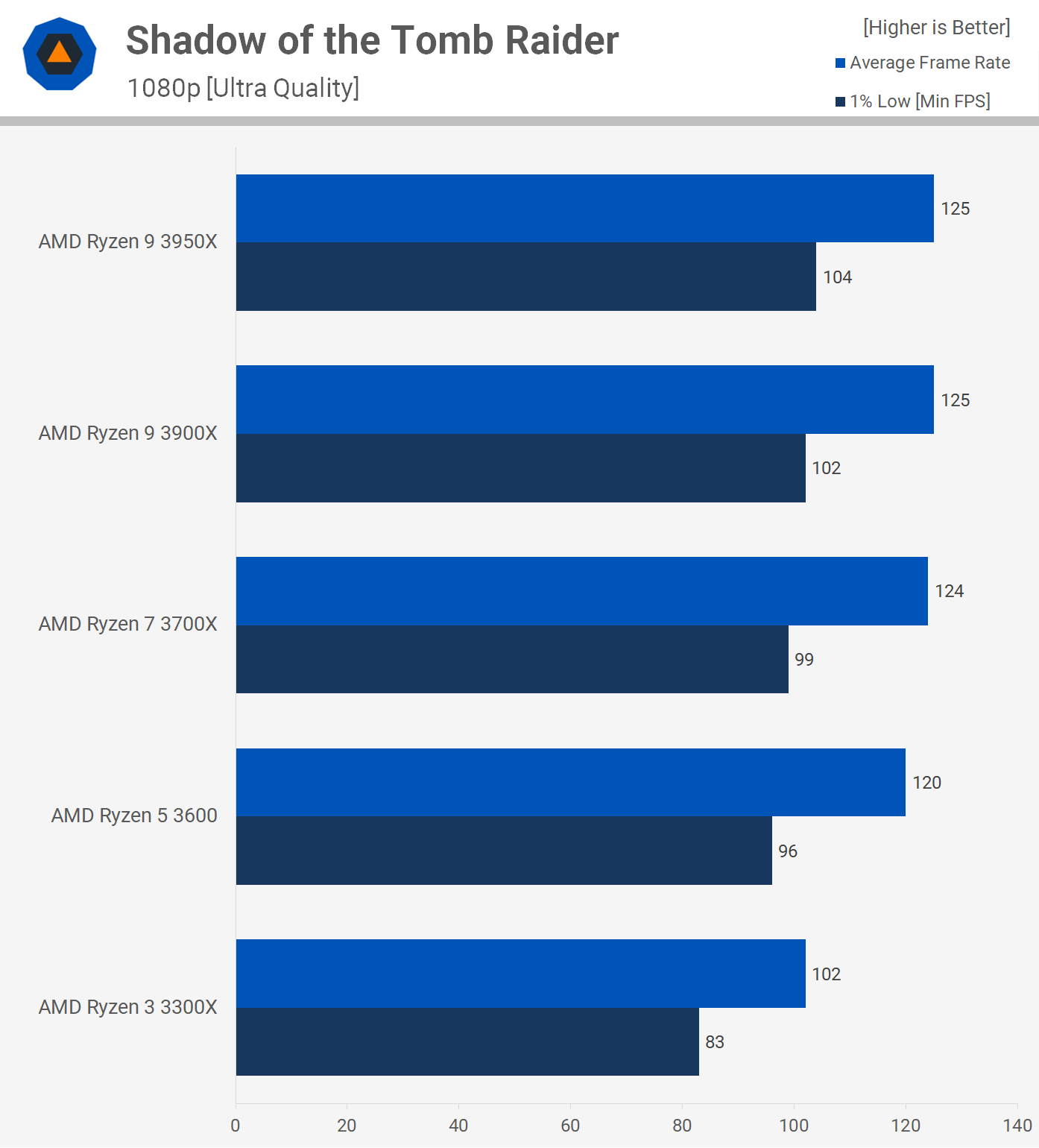 Shadow of the Tomb Raider est un bon exemple de jeu qui peut être extrêmement exigeant en termes de processeur et nous constatons ici une amélioration significative des performances lors du passage du Ryzen 3 3300X au Ryzen 5 3600, pour près de 20% de performances en plus. Au-delà de six cœurs cependant, il y a peu à gagner.