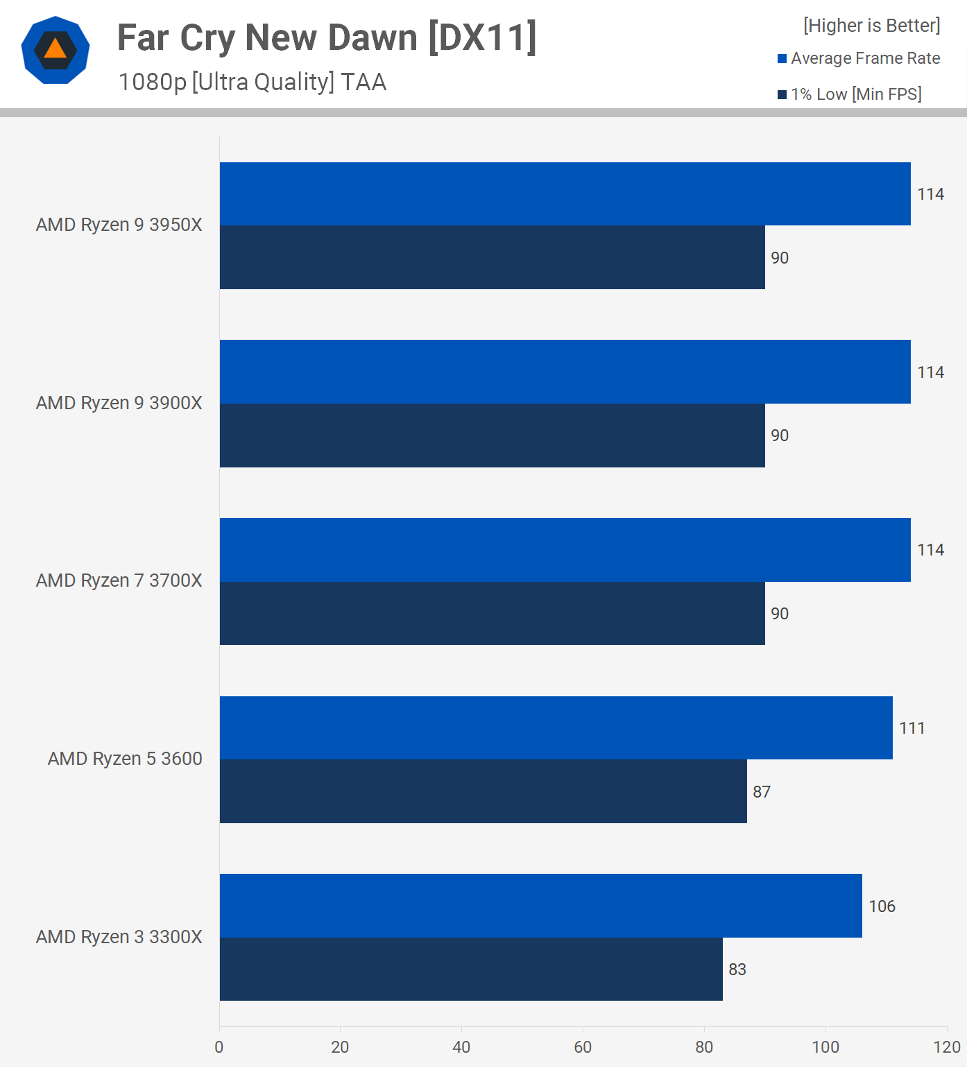 En passant à Far Cry New Dawn, nous trouvons une autre situation où le 3600 est un peu plus rapide que le 3300X grâce aux deux cœurs supplémentaires et le 3700X est encore un peu plus rapide, mais au-delà de cela, il n'y a pas de gains de performances à voir avec le 12 et des modèles à 16 cœurs dans ces conditions de test.