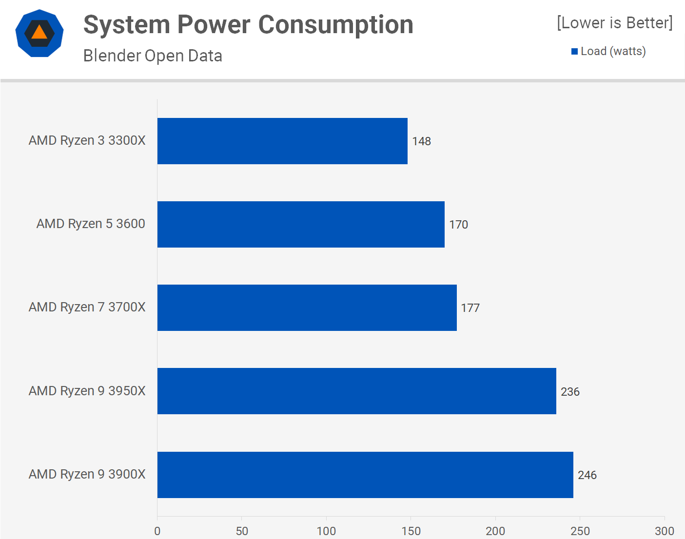 Le 3900X est le processeur le plus gourmand en énergie, et bien que vous puissiez vous attendre à ce que cet honneur revienne au 3950X, en raison d'un processus de binning qui voit AMD réserver le meilleur silicium pour le 3950X, le processeur 16 cœurs est capable de fonctionner à des tensions plus basses. et consomment donc moins d'énergie.