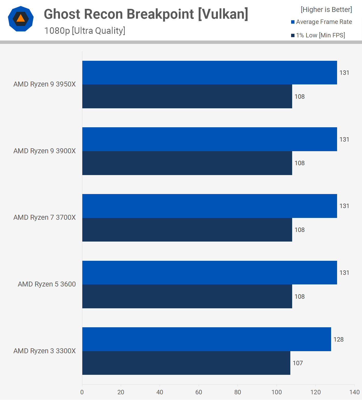 Ensuite, nous avons Ghost Recon Breakpoint et c'est un bon exemple d'un jeu qui n'est pas particulièrement sensible du côté du processeur, en supposant que vous ayez au moins un quad-core décent avec le support SMT, ce qui est exactement ce que vous obtenez avec le 3300X .
