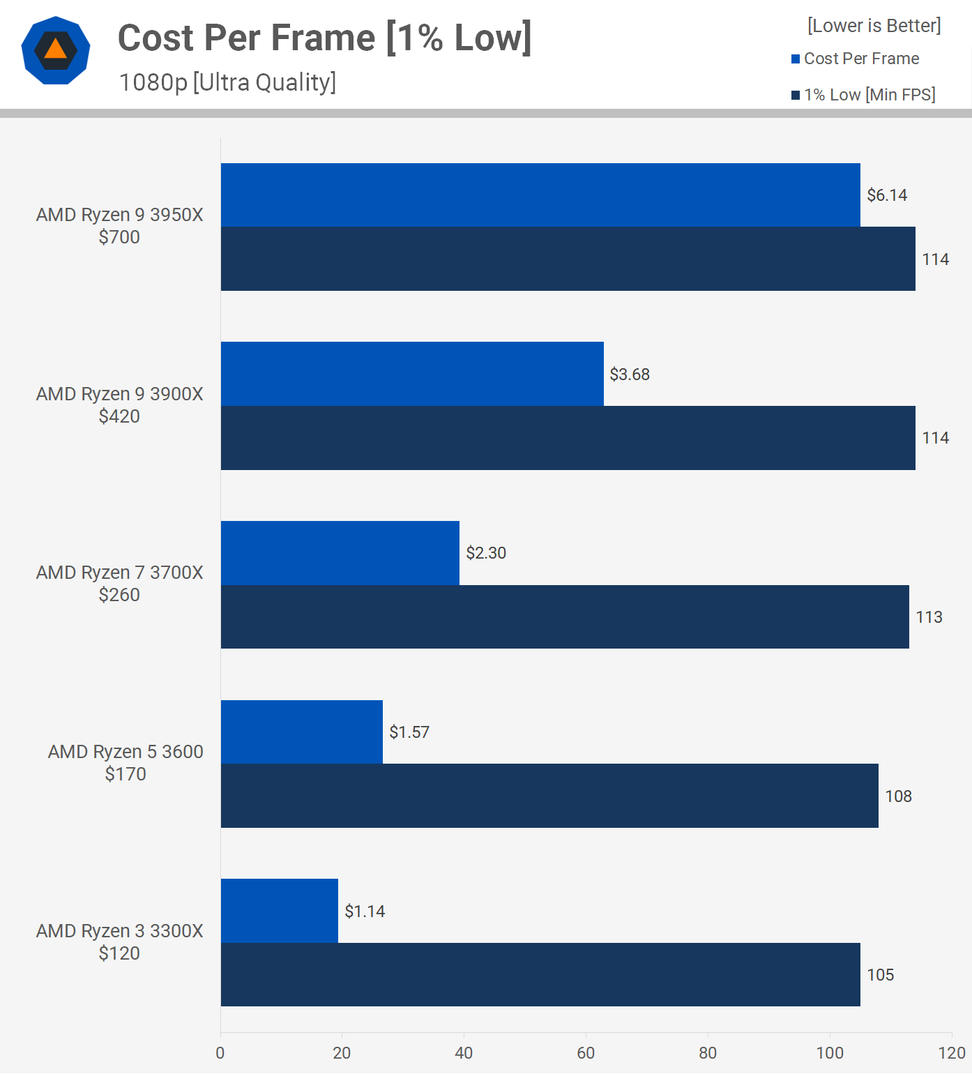Le Ryzen 3 3300X est clairement le processeur de jeu le plus rentable, avec seulement 1,14 $ par image lors de nos tests. Cependant, comme on le voit dans Shadow of the Tomb Raider, le 3300X peut glisser dans des titres plus exigeants et il ne faudra peut-être pas longtemps avant que les processeurs 4 cœurs / 8 threads deviennent inadéquats pour les derniers et les plus grands titres, bien que cela reste à voir. .