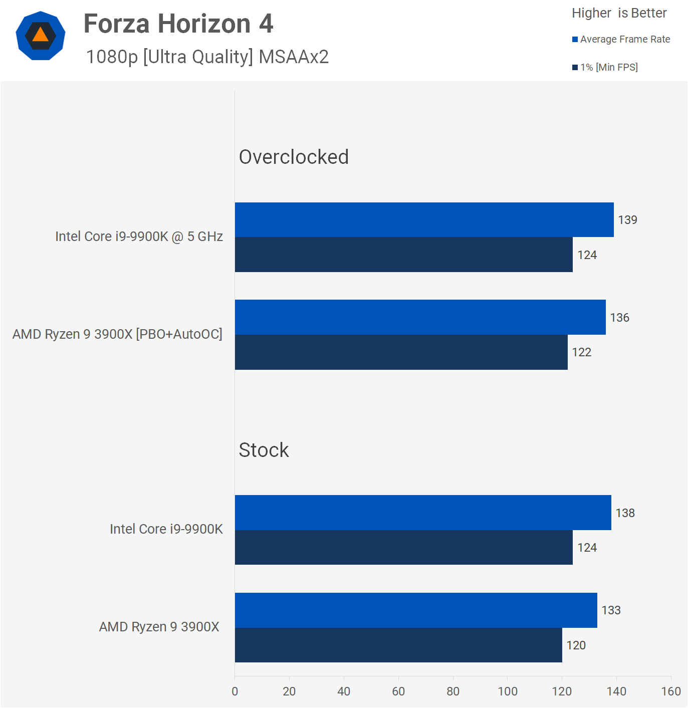 Ensuite, nous avons Forza Horizon 4. Ici, le 3900X est distancé de 4% lorsque l’on compare les performances immédiates. Cette marge a été divisée par deux avec les deux processeurs overclockés. À ce stade, nous pensons qu’il est juste de dire que le 9900K optimise les performances du RTX 2080 Ti. C’est en grande partie un jeu lié au GPU, mais il mérite toujours d’être testé étant donné sa qualité et sa popularité. C’est un jeu magnifique et amusant, sans aucun doute.