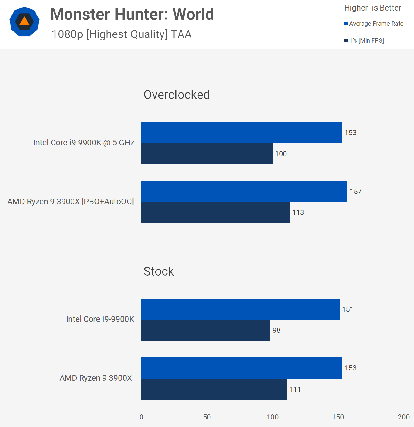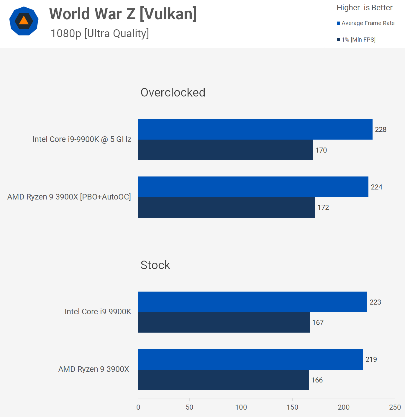Nous avons testé la dernière version de World War Z, qui apporte de nombreuses corrections et améliorations des performances. Les stocks et overclocké le 9900K était environ 2% plus rapide que le 3900X, ce qui est une différence négligeable. Il va sans dire que l’expérience de jeu était indiscernable entre les deux processeurs et que tous deux permettaient au RTX 2080 Ti de générer un rendu de plus de 160 images par seconde à tout moment.