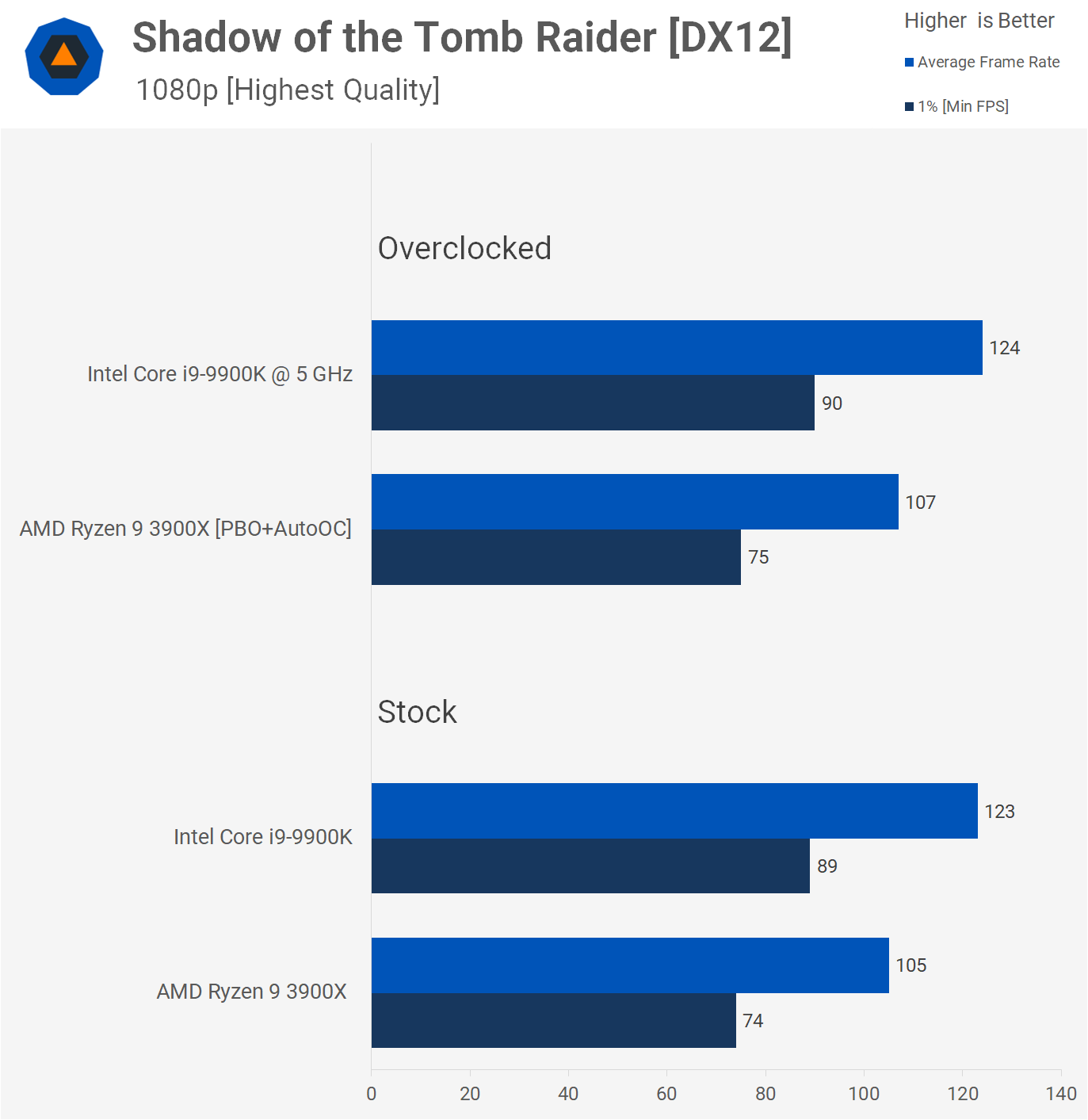 Avec les deux processeurs overclockés, le 9900K était 12% plus rapide, ce qui constitue toujours un avantage de performance raisonnable. 1% faible performance était plus proche, mais l’écart était toujours là entre les deux.