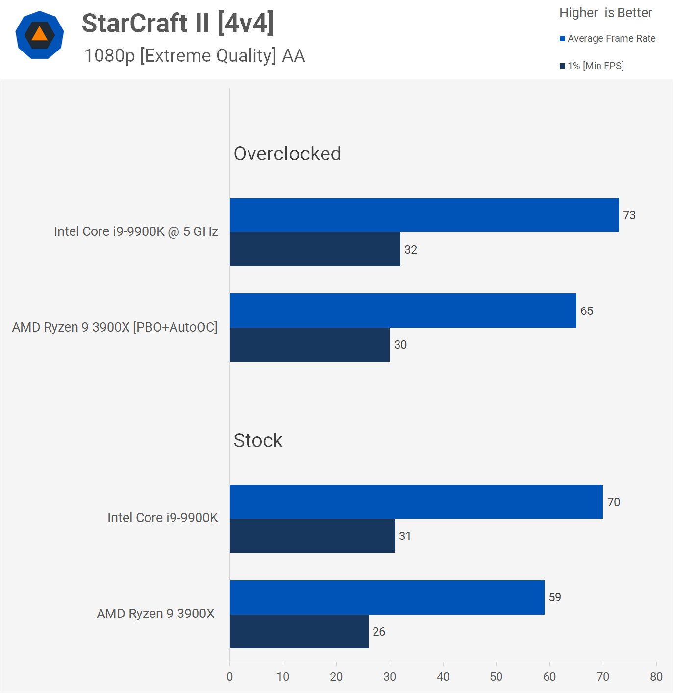 StarCraft II a été très sollicité pour cette comparaison et nous devons admettre que c’est la première fois que nous mesurons le pire scénario de ce titre. Les repères précédents étaient basés sur le jeu 2v2, mais il semble que Ryzen ait du mal à se battre avec les plus gros matchs 4v4 lorsque toutes les équipes sont au maximum. Il s’agit donc du pire des scénarios et, malheureusement, pour AMD, le Core i9 est 19% plus rapide à l’origine par rapport à la vitesse de traitement des données par rapport au taux de trame moyen.