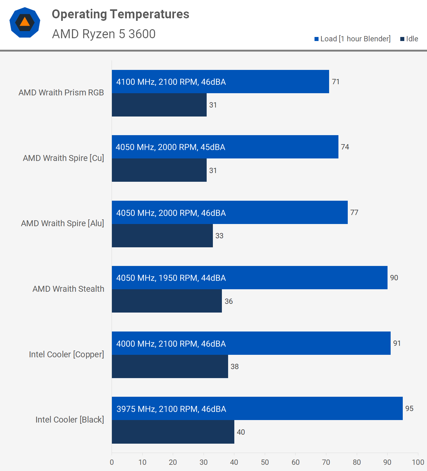 Le Wraith Stealth a vu le processeur Ryzen atteindre 90 degrés, ce qui est loin d’être idéal. À cette température, la R5 3600 est toujours maintenue à 4050 MHz, mais elle devait être proche de la baisse à 4000 MHz, cette fréquence étant celle que nous avons vue avec le cuivre. la version de la boîte d’information d’Intel et elle ne fonctionnait qu’à un degré plus élevé.