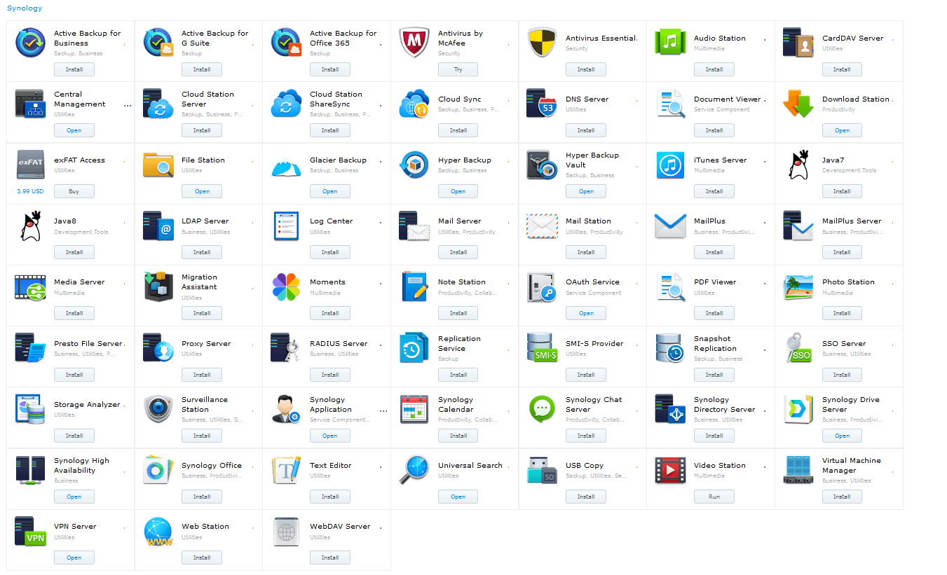Le système d'exploitation de Synology possède une boutique d'applications intégrée, tout comme vous l'utiliseriez sur votre téléphone. À partir d'ici, vous pouvez télécharger tous les types d'applications pour vous aider avec les sauvegardes, la lecture multimédia, la sécurité, la maintenance du système, le développement, etc. Il existe environ 140 applications différentes que vous pouvez installer. Environ la moitié proviennent de Synology eux-mêmes et le reste provient de développeurs tiers. Il y a même un gestionnaire de machine virtuelle au cas où vous voudriez exécuter Windows ou Linux sur votre NAS.