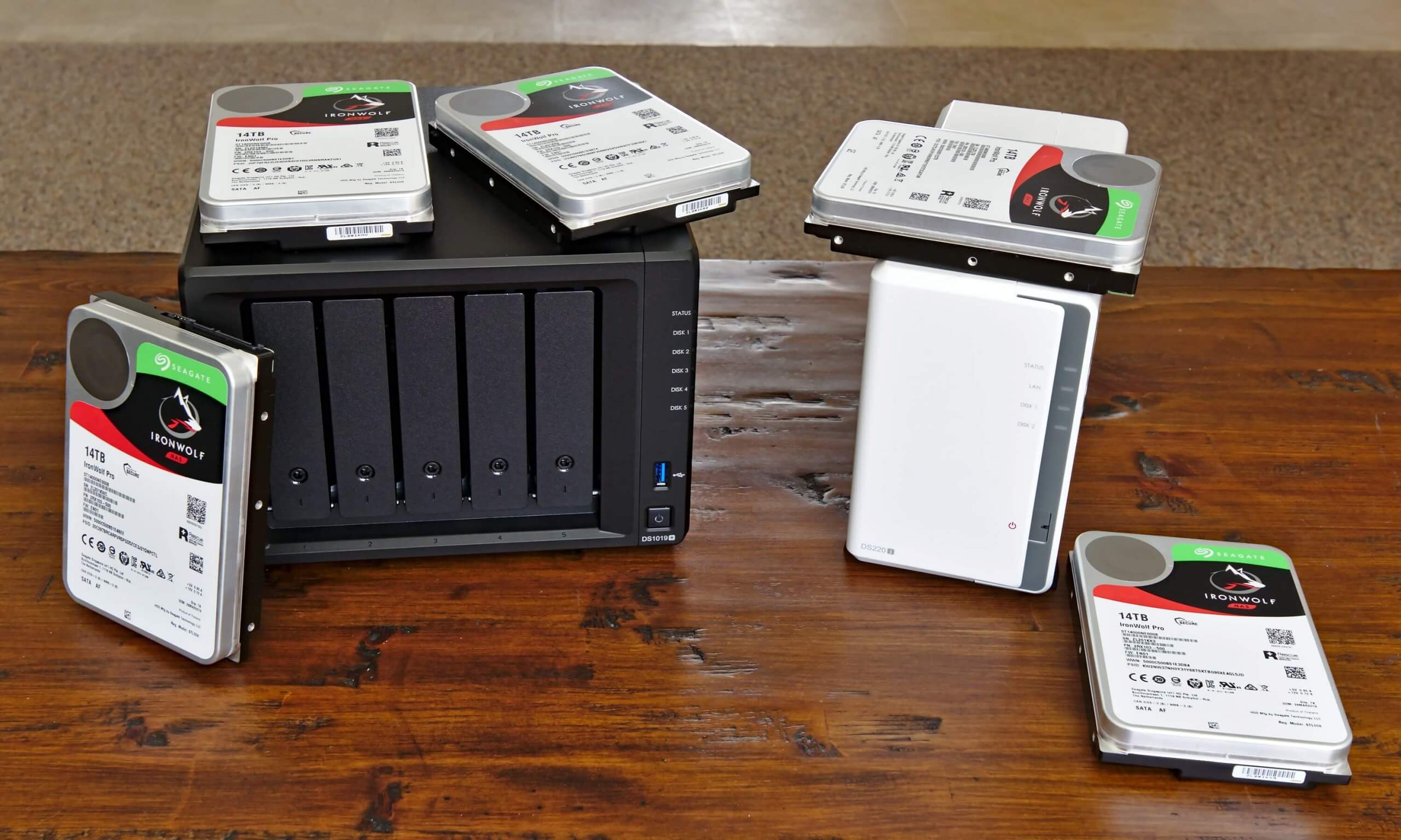Pour assembler cet article, Synology a envoyé son DiskStation DS1019 + à cinq baies et son DS220j à deux baies pour tester. Les deux sont des appareils NAS très populaires et très appréciés. Je les ai remplis avec les disques NAS IronWolf Pro 14 To de Seagate. Il ne s'agit pas d'un examen de l'une ou l'autre des unités NAS elles-mêmes, mais nous prendrons une minute pour les parcourir brièvement afin de comprendre quelles sont les fonctionnalités et la valeur qu'elles offrent.