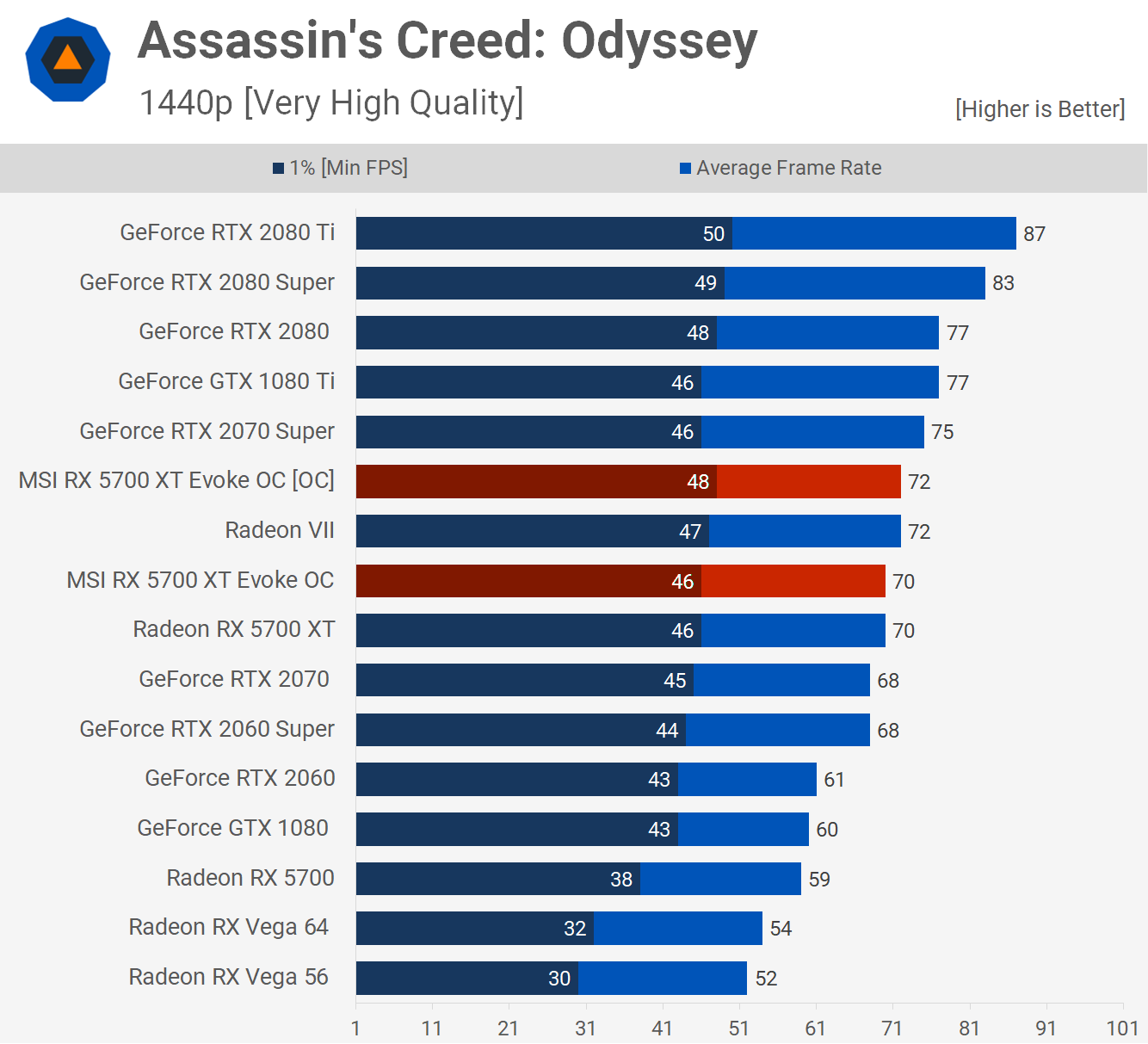 Encore une fois, nous observons que les performances de Evoke OC sont identiques à celles de la carte de référence dans Forza Horizon 4 et que l’overclocking ne faisait qu’accroître le taux de trame de 2%. Pour ceux qui ne sont pas à la vitesse, oui, ces résultats sont corrects. Les GPU RDNA le détruisent absolument dans Forza Horizon 4, mais cela n’est pas représentatif de la performance de tous les jeux.