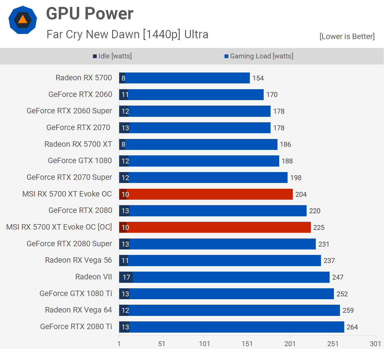 En ce qui concerne la consommation électrique, Evoke OC consomme un peu plus d'énergie que le modèle de référence, il semblerait que ces 50 MHz supplémentaires vous coûteront environ 20 watts de puissance GPU, mais qu'à un peu plus de 200 watts, le 5700 XT n'est pas un cochon de puissance compte tenu de la performance.