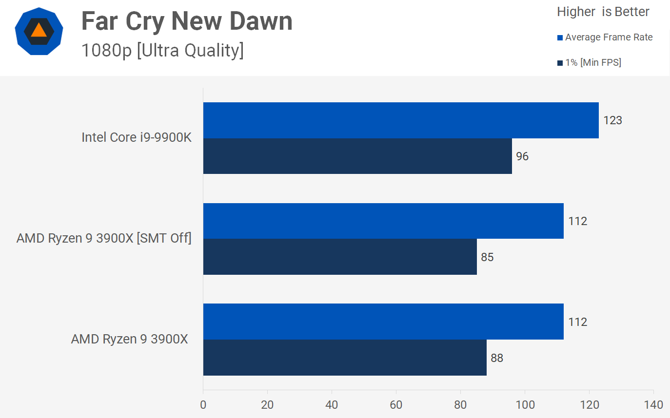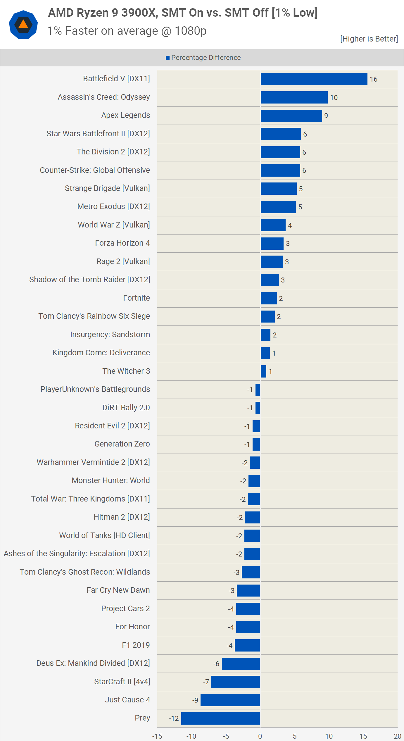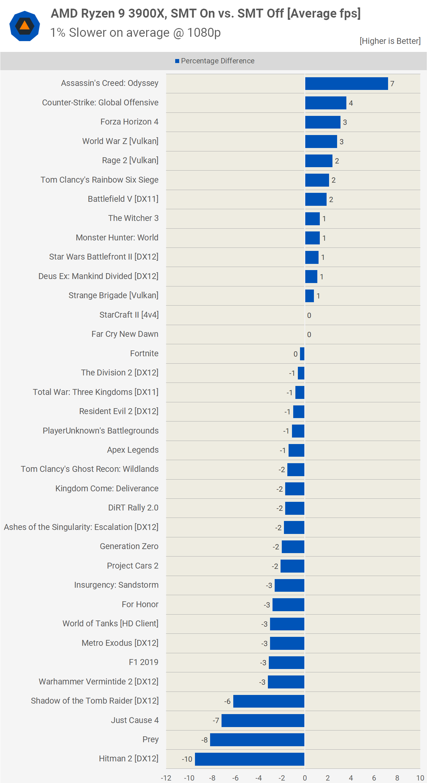 En moyenne, le Ryzen 9 3900X n’était que 1% plus lent dans l’ensemble avec le SMT activée, sa configuration standard prête à l'emploi lorsque vous activez tous les 24 threads avec le multithreading simultané. Nous constatons ici que la marge de performance se situe dans les 5% pour la grande majorité des titres testés, et nous dirions que nous avons constaté une différence de performance négligeable dans 31 des 36 jeux testés.