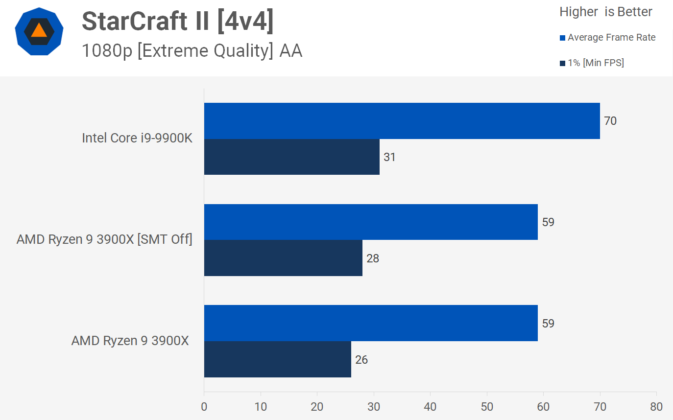 Les tests avec StarCraft II ne montrent aucune amélioration des performances avec la technologie SMT désactivée lorsque l’on examine la fréquence de trame moyenne, bien que nous constations une hausse des performances pour le résultat faible de 1%.