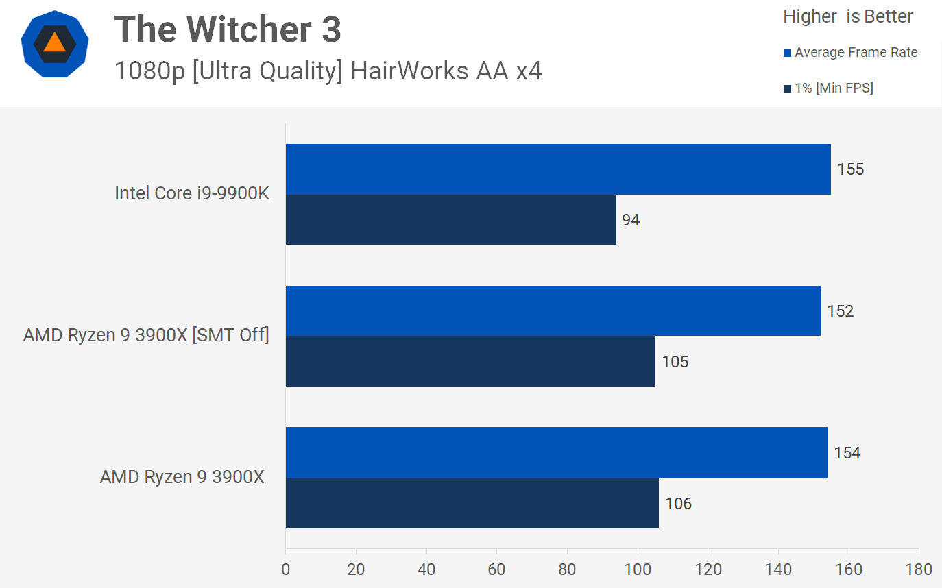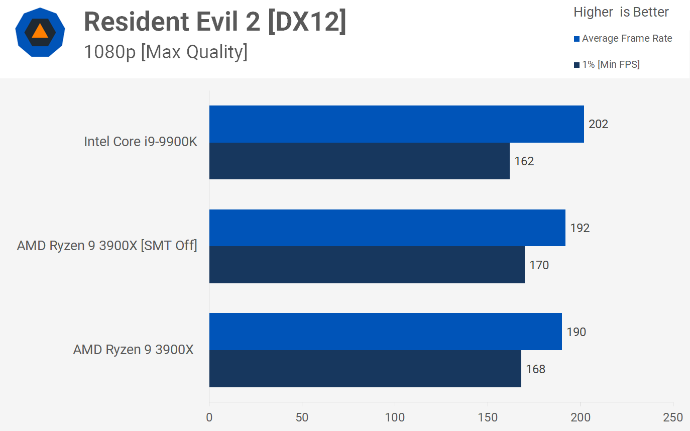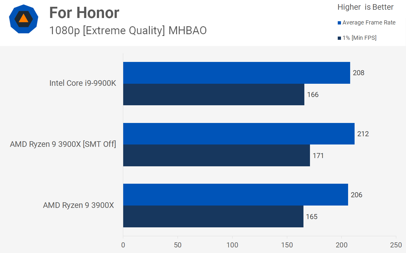 Les tests avec For Honor montrent une amélioration de 3 à 4% des performances avec le SMT désactivé, ce qui était en fait suffisant pour faire passer le 3900X devant le 9900K de ce titre. Bien sûr, nous n’avons pas testé la version 9900K avec la technologie Hyper-Threading désactivée et il ya de très bonnes chances que les performances des processeurs Intel soient également améliorées dans ce titre.
