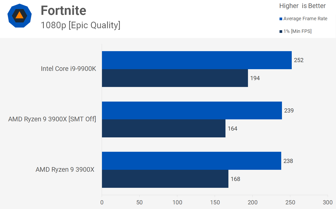 Fortnite est le genre de jeu auquel nous nous attendions ou qui supposait que désactiver SMT pourrait aider et cela semble être le cas, en quelque sorte. Franchement, les résultats sont bien dans la marge ou l'erreur …