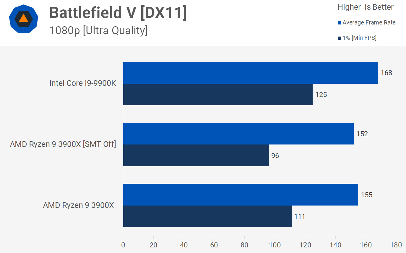 Il est intéressant de noter que la cadence moyenne était pratiquement la même avec SMT désactivé dans Battlefield V, nous constatons une réduction assez substantielle de la performance pour le résultat faible de 1%, car la cadence a chuté de 14%. Cela ressemble donc à un autre titre si vous ne voulez vraiment pas désactiver SMT.