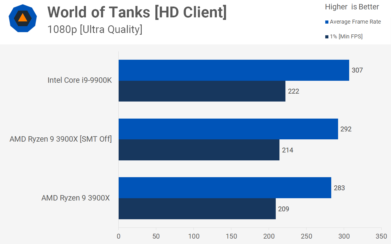Désactiver SMT aide à améliorer les performances dans World of Tanks. Ici, le 3900X a bénéficié d’une augmentation de 3% de la cadence moyenne. À présent, le 9900K n’est que 5% plus rapide, bien qu’il soit possible de désactiver l’Hyper-Threading pour améliorer également les performances du 9900K.