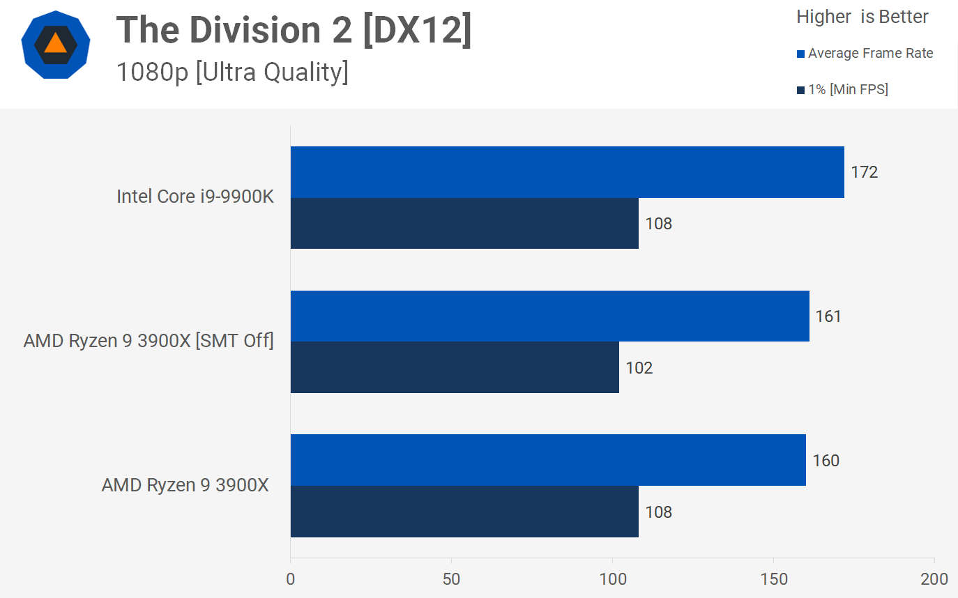 Les performances de The Division 2 étaient quasiment identiques à celles sans support SMT, du moins en ce qui concerne le taux de trame moyen. Nous constatons une réduction de 6% avec la technologie SMT désactivée pour le taux de trame faible de 1%. Lors du test de ce jeu sans SMT, nous avons également remarqué que le résultat faible de 1% avait tendance à fluctuer assez, ce que nous n’avons pas vu avec 24 threads actifs.