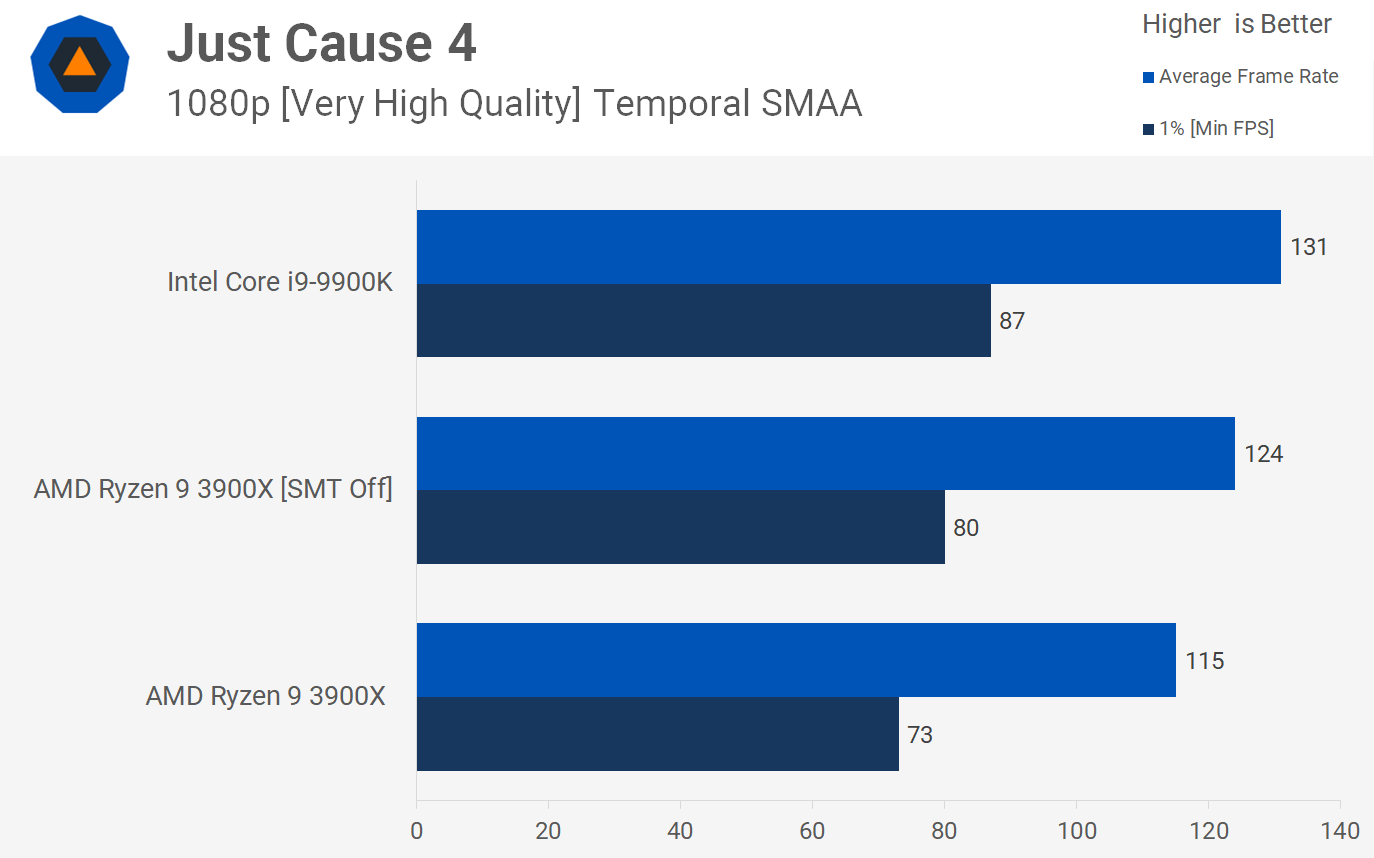 Just Cause 4 voit également un gain de performance très remarquable de 8 à 10% avec SMT désactivé et voit le 3900X se rapprocher à nouveau du 9900K.