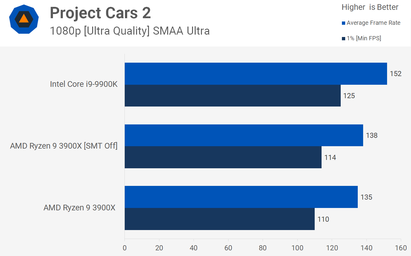 Project Cars 2 constate une légère amélioration des performances de 2 à 4% avec SMT désactivé. Bien que ce soit agréable à voir, la 9900K ne risque pas de perdre la couronne performance de ce titre.