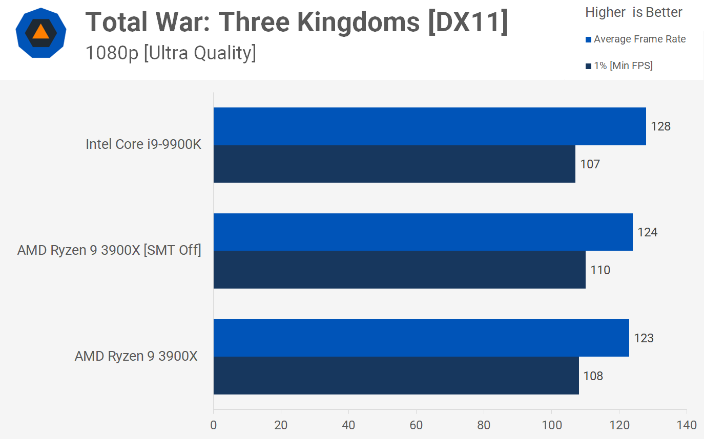 Lors des tests avec Total War Three Kingdoms, les performances sont pratiquement identiques, nous constatons un avantage de 1 à 2 ips en faveur de la configuration désactivée pour SMT, mais cela reste assez proche de la marge ou de l’erreur.