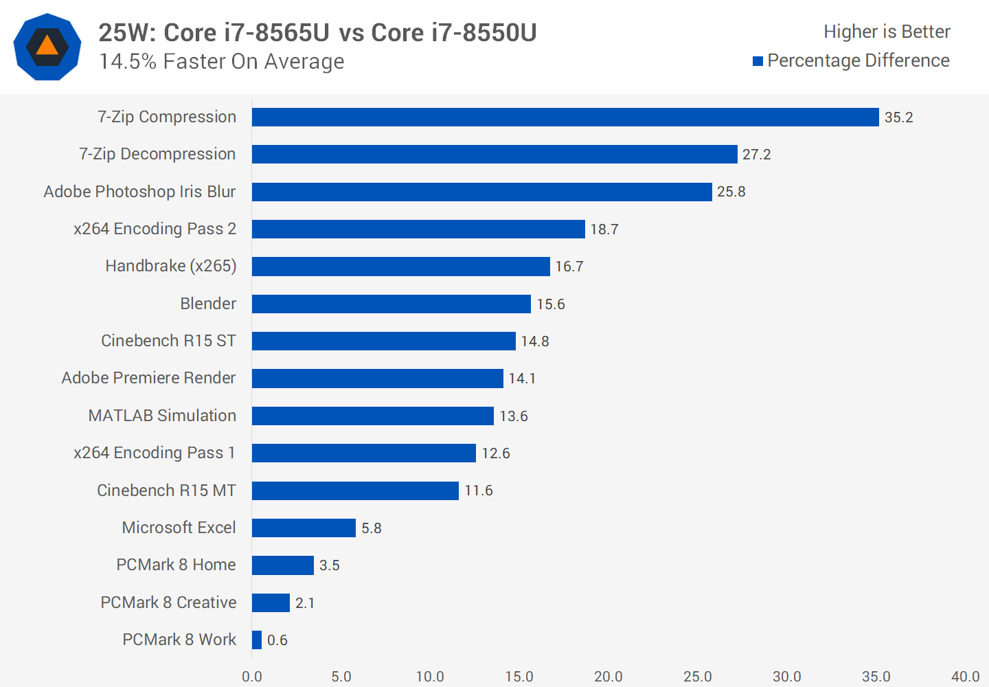 En comparant les configurations 25W, les gains sont plus significatifs. Nous constatons ici une amélioration moyenne de 15%, avec un gain en bonne santé pour les charges de travail plus longues. Cela correspond davantage aux différences de vitesse d'horloge entre les deux processeurs; le 8565U est simplement plus haut, vous pouvez donc vous attendre à de meilleures performances, en particulier avec une limite de puissance plus élevée.