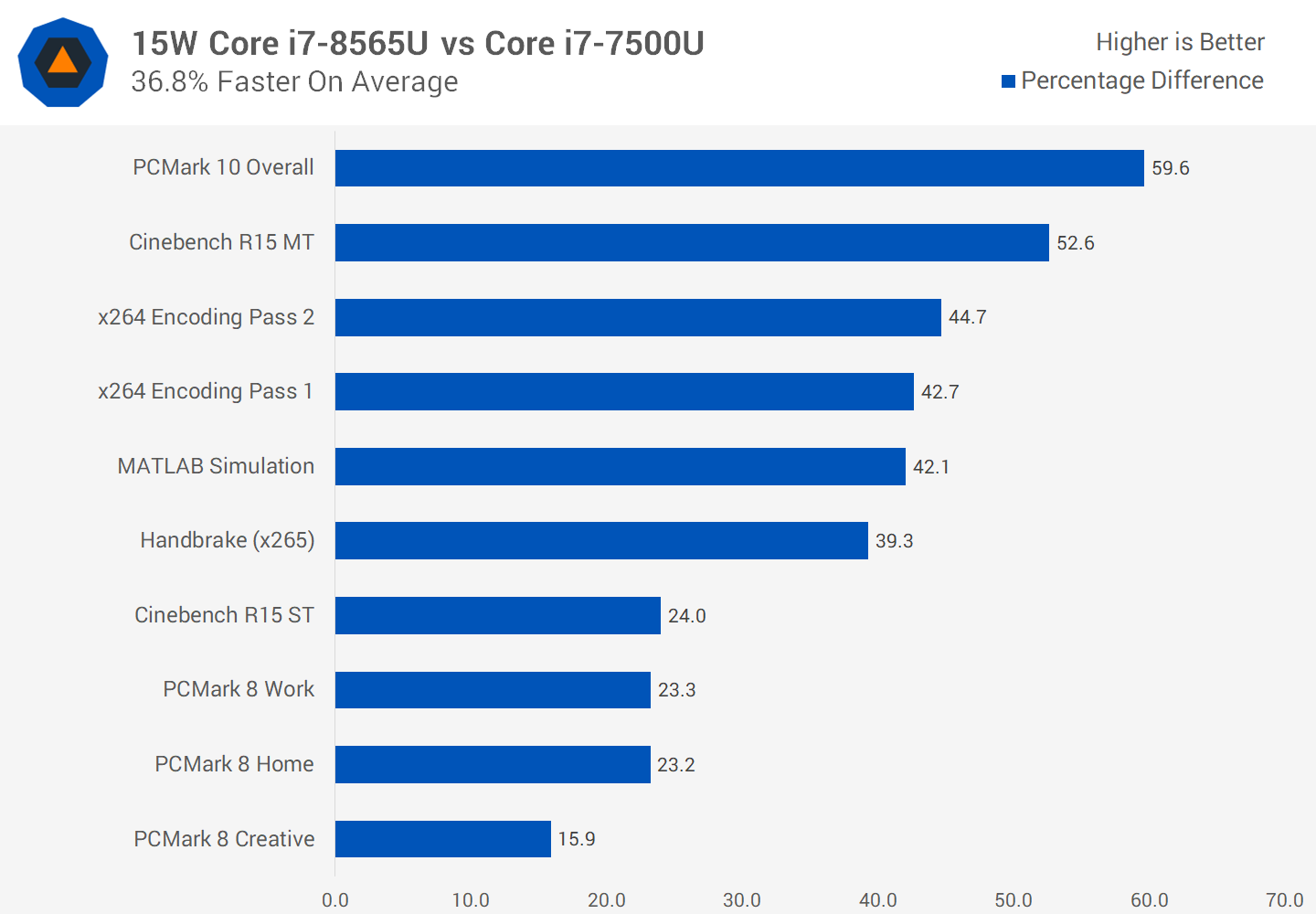 En moyenne, la configuration de 15 W du 8565U est 8% plus rapide que celle du 8550U, bien que ces gains apparaissent largement dans les charges de travail à thread unique, les charges de travail courtes ou une combinaison des deux. Avec des charges de travail plus longues comme l'encodage, vous pouvez vous attendre à une amélioration des performances inférieure à 5%.